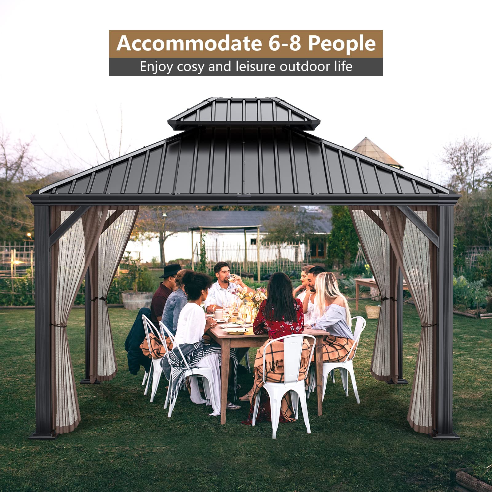 If you want to build an extra shade for relaxing in your backyard, this hardtop gazebo will be a nice choice! Compared with a common canopy made of fabric, our hardtop sun shelter made of heavy-duty galvanized steel is more sturdy and reliable in an outdoor environment. It performs well in rustproof, wind-resistance, and rainproof abilities. The 2-tier roof could load snow up to 3600 lbs in cold winter. The air vent can not only increase its wind resistance but also facilitate heat dissipation. In addition, you can hang a fan or lamp on the central hook to improve the degree of comfort under the canopy. It's suitable for 6-8 people in daily use.