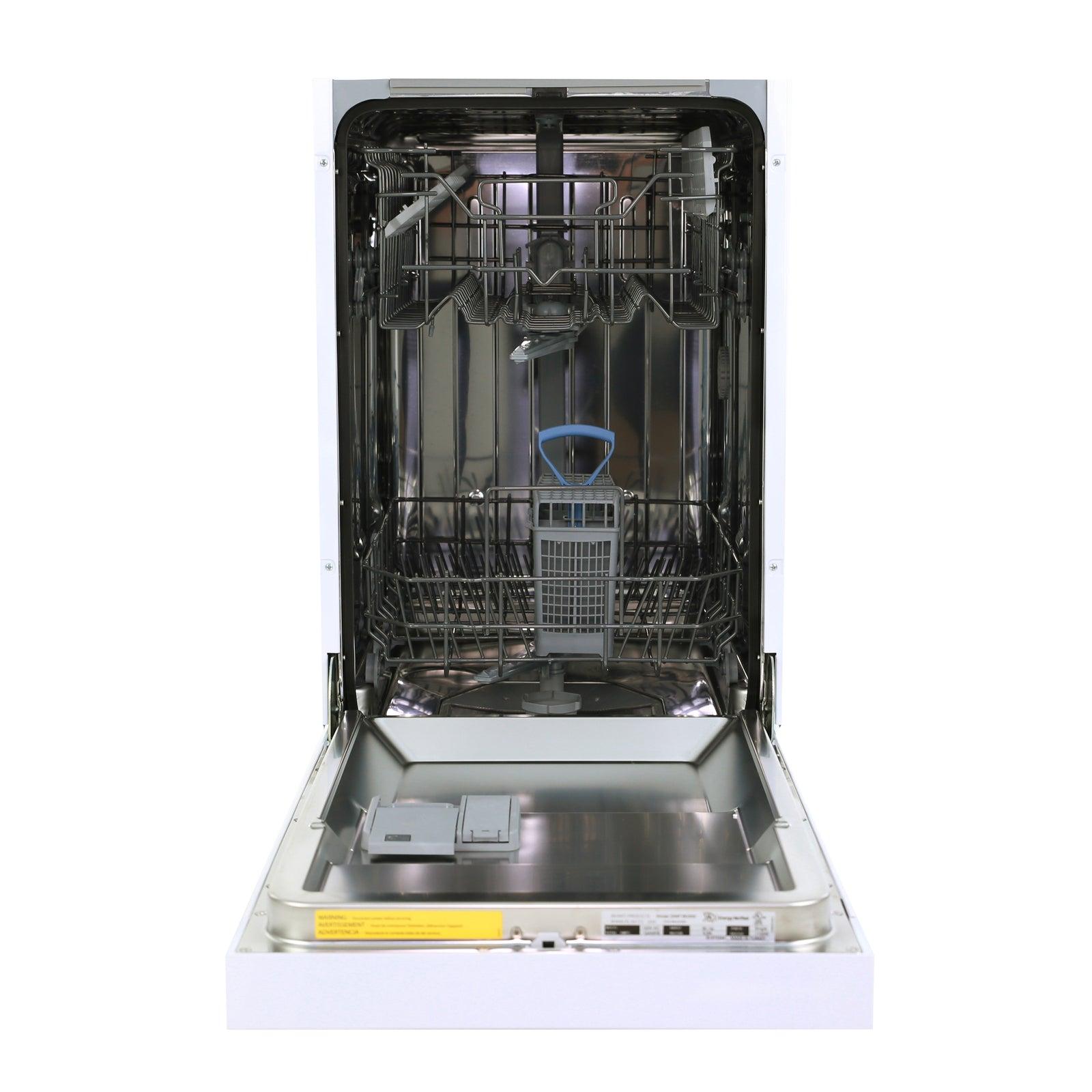 A: This compact 18-inch built-in dishwasher offers 8 place settings, 6 wash cycles, and 3 additional options including High Temp Wash, Sanitize, and Extra Dry.