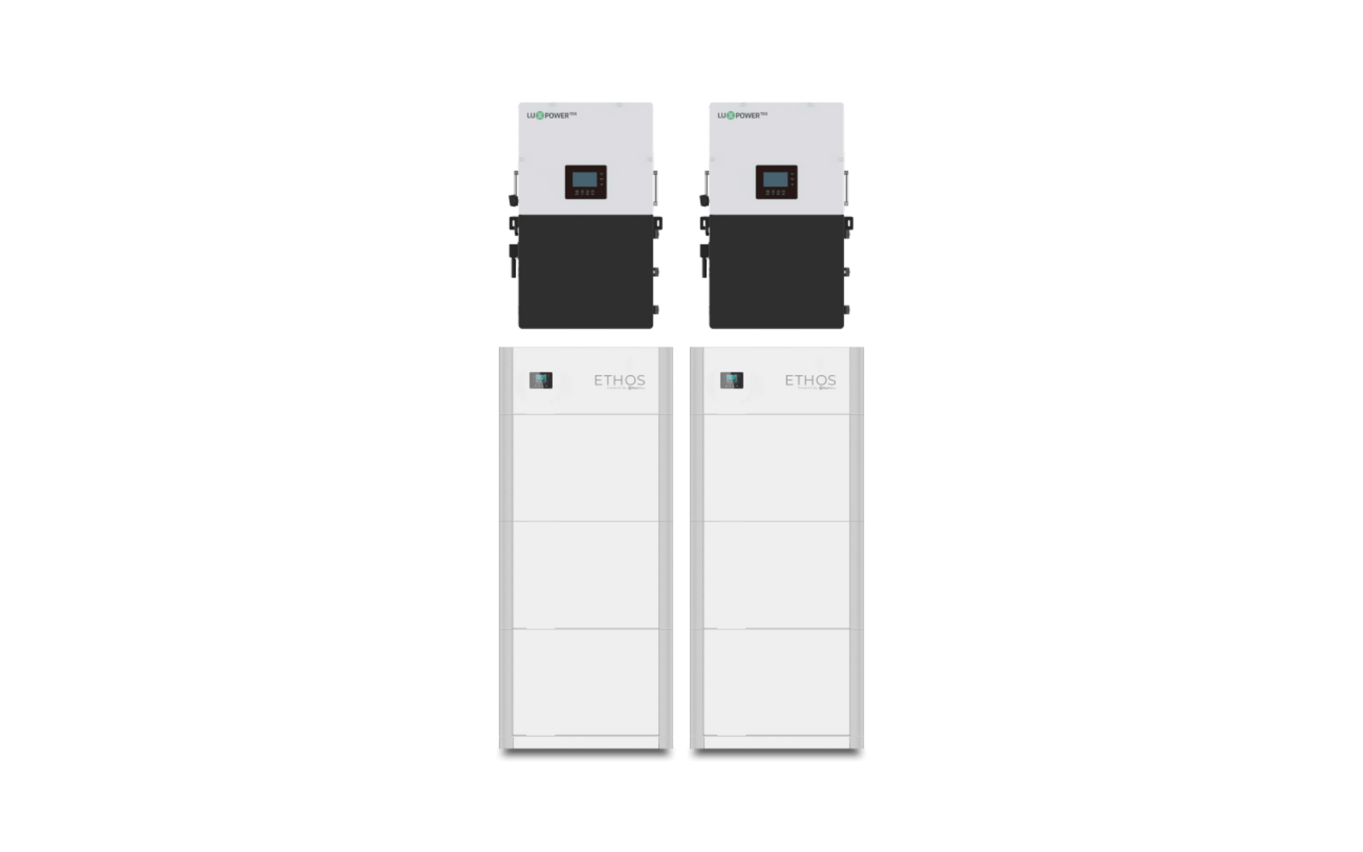 But that’s not all. We pair this ETHOS system with 2 cutting-edge 12000W Lux inverters, which feature their own LCD touch screen displays, 3 MPPT inputs each, integrated UPS modules for seamless on and off-grid switching, and the ability to handle PV arrays of up to 36000W. Plus, through their smart load control, AC coupling abilities, and peak shaving functions, you can meet your power needs and protect your home against unstable grids or rolling blackouts, while seeing huge savings each month on your electric bill.