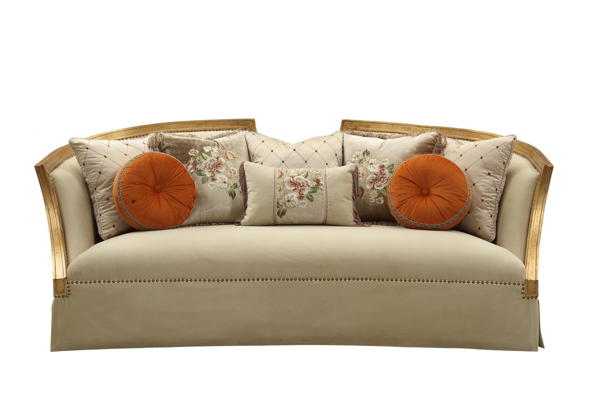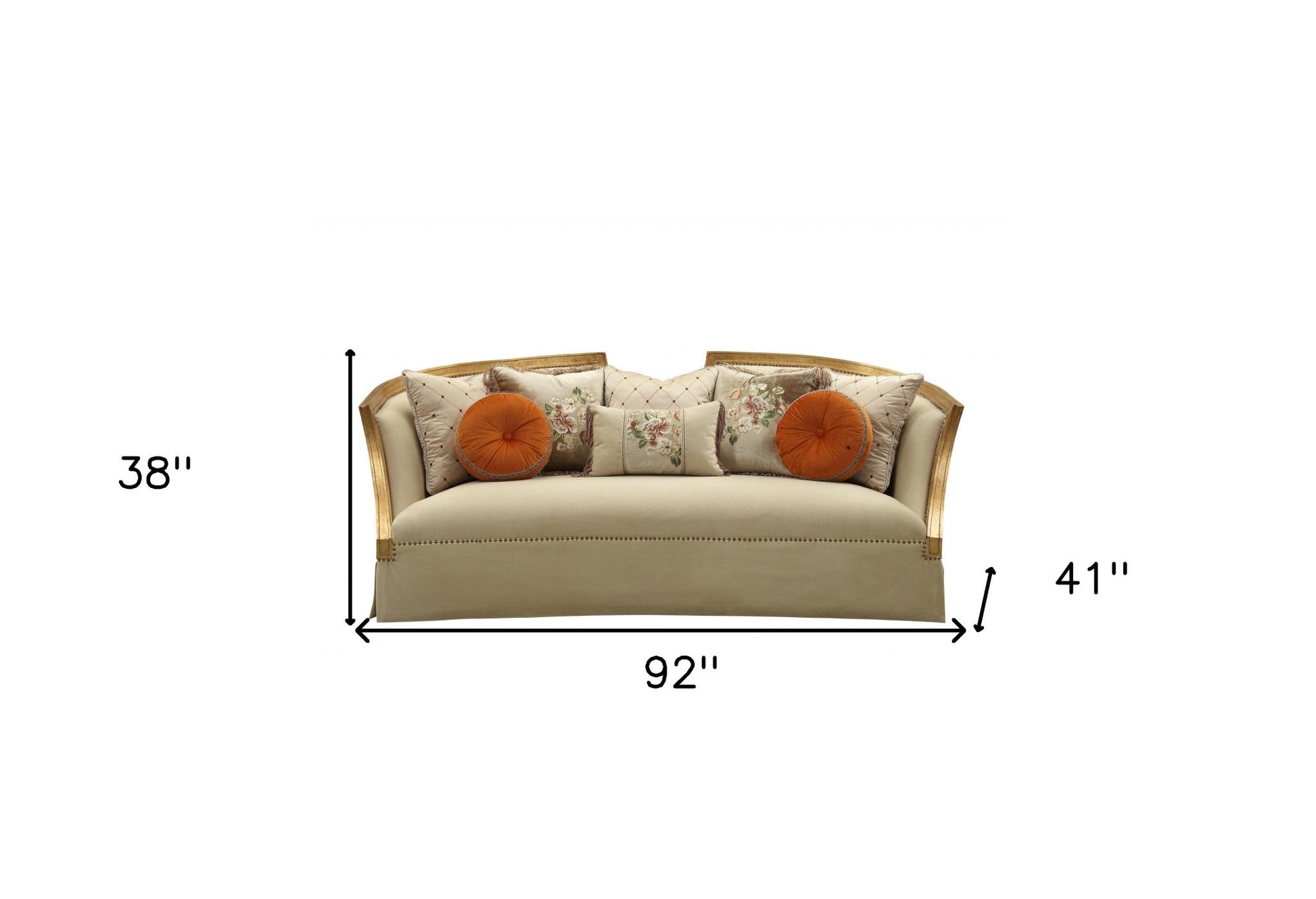 Transform your home's interior with this luxurious 41-inch beige velvet curved sofa and toss pillows with natural legs. With a warm and rich look to it, this solid color curved is upholstered in velvet that is designed to be super soft to the touch, sturdy and resilient. Solid colors give you lots of decorative options and are easy to work into your decor scheme. Nailhead trim gives this sofa a refined look that adds additional texture and visual interest. Flared arms offer a comfy place to rest. Natural solid wood legs effortlessly elevate the room and add a touch of contemporary design. A great showpiece for your room, this sofa is a must have. 38-inch H x 41-inch W x 92-inch D