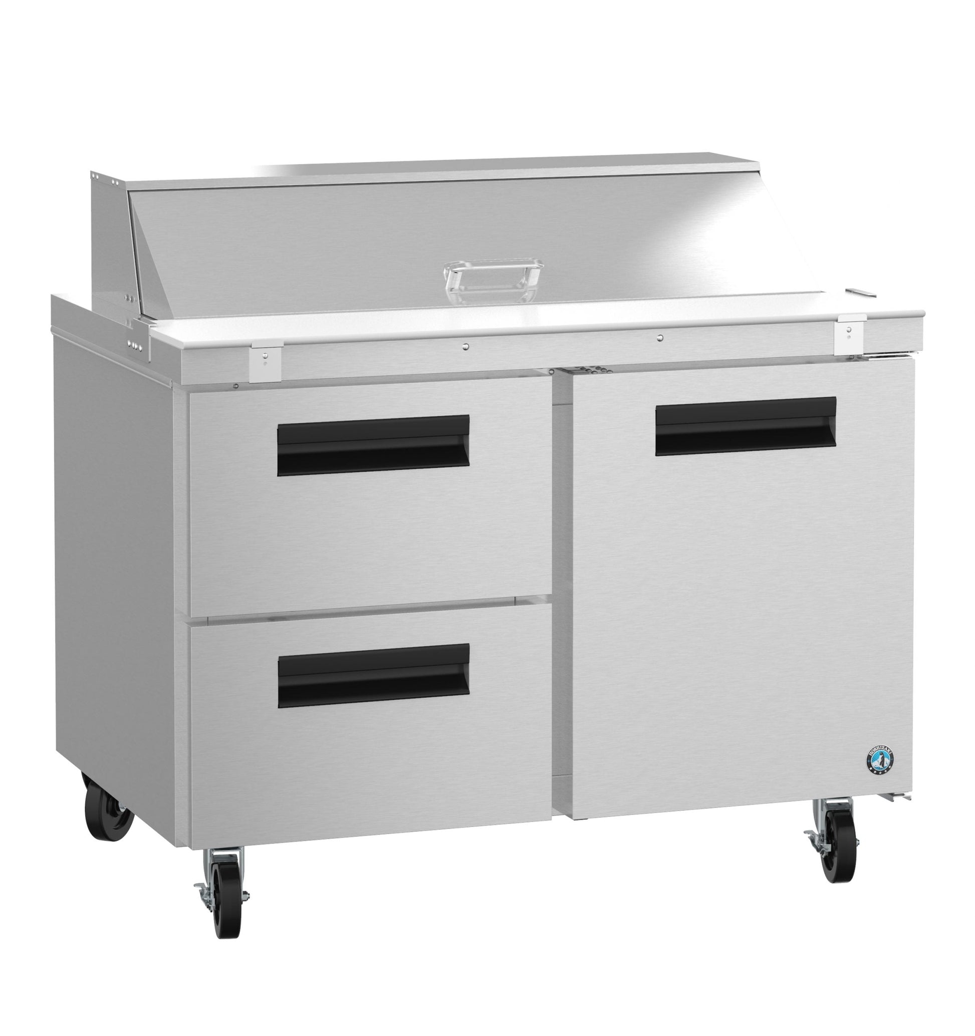 The SR48B-12D2 also includes (1) epoxy coated wire shelves and (2) stainless steel drawers each with (1) divider bar, (4) 6″ stem casters (2 with brakes) are standard, plus a the drawer slides are constructed of 16 gauge stainless steel with durable acetal rollers. Electrical consumption of 2.83 kWh/day at 3 Amps, 10 ft long cord with a 5 – 15P NEMA plug. 48″ x 10″ x 0.5″ thick white polyethylene cutting board is standard. The unit is ETL Safety (US & C) Listed, ETL Sanitation, Georgia Made Certified and includes a six years parts warranty, five years labor , and seven years compressor .