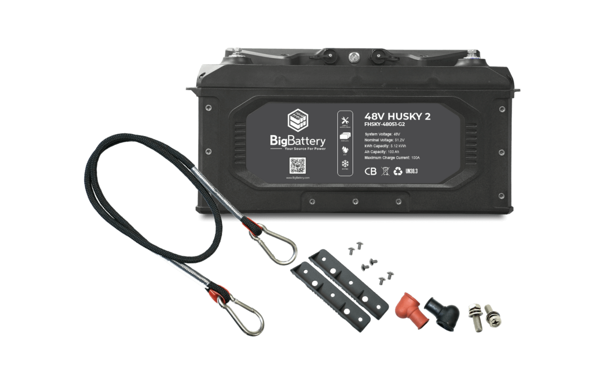 SECOND GENERATION POWER STORAGE IS HERE! The 48V 10.24 kWh LiFePO4 2x HUSKY 2 Kit is the latest and greatest from BigBattery, providing a robust solution, with unmatched reliability and efficiency, for your Golf Cart, Utility Cart, RV, & Camper Van applications.