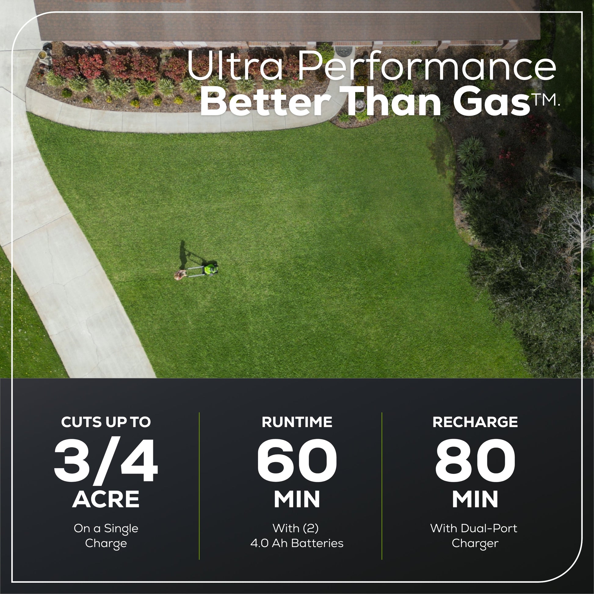 Equipped with two (2) 4.0Ah batteries and a dual-port charger for extended runtime—ideal for medium to large lawns.