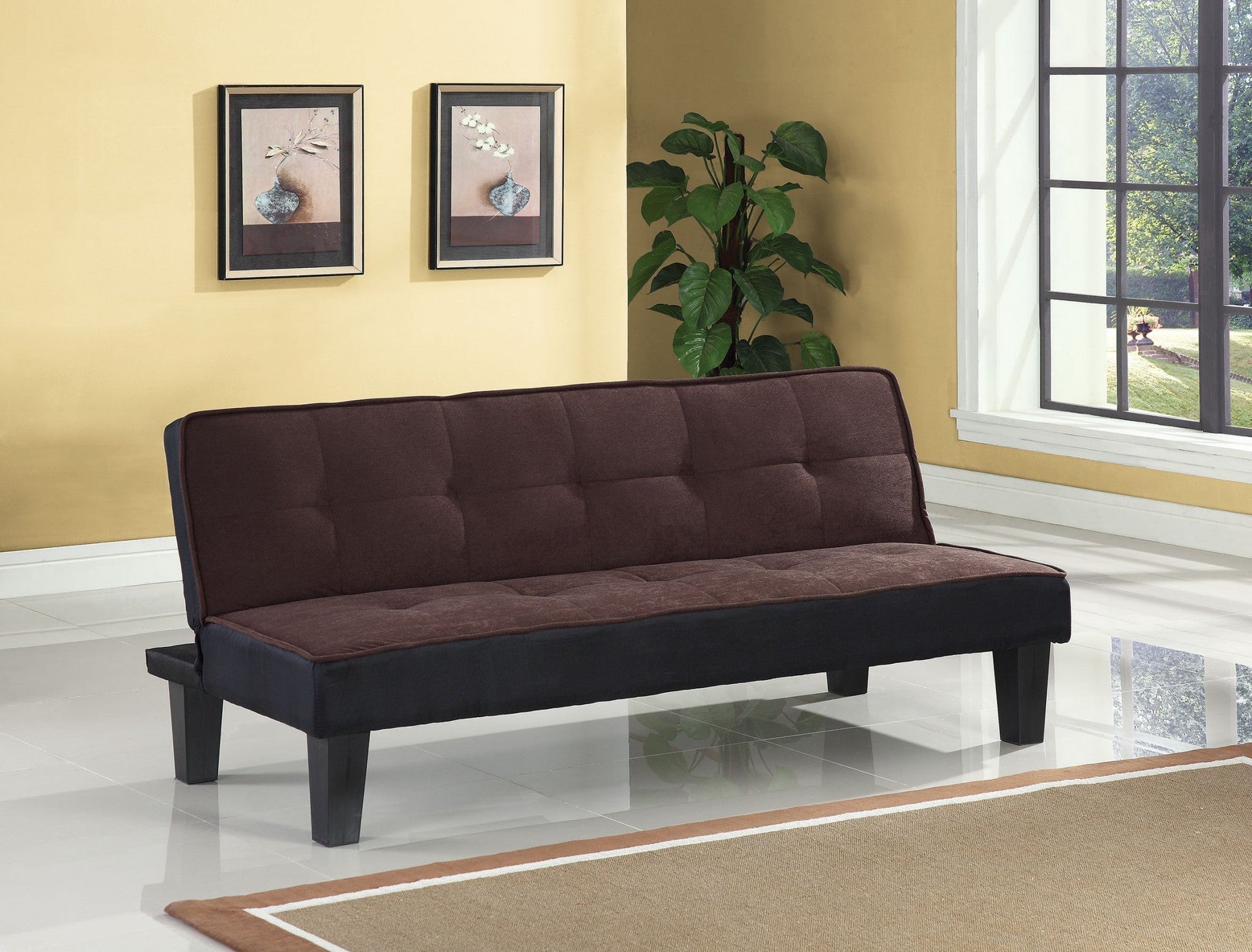 Designed for comfort and good looks, this 66-inch dark brown microfiber convertible futon sleeper sofa with black legs is a great option to anchor your space. Built to last, this solid color convertible futon is upholstered with microfiber that is designed to be soft, resilient, easy to maintain, and stand the test of time. Solid colors give you lots of decorative options and are easy to work into your decor scheme. Designed with an updated and refreshing style, this sofa is armless to create that unique contemporary or modern aesthetic. The tufted stitching pattern adds visual interest and fine designer detailing. Built to last, this sofa will be a great centerpiece for your room. 28-inch H x 66-inch W x 29-inch D