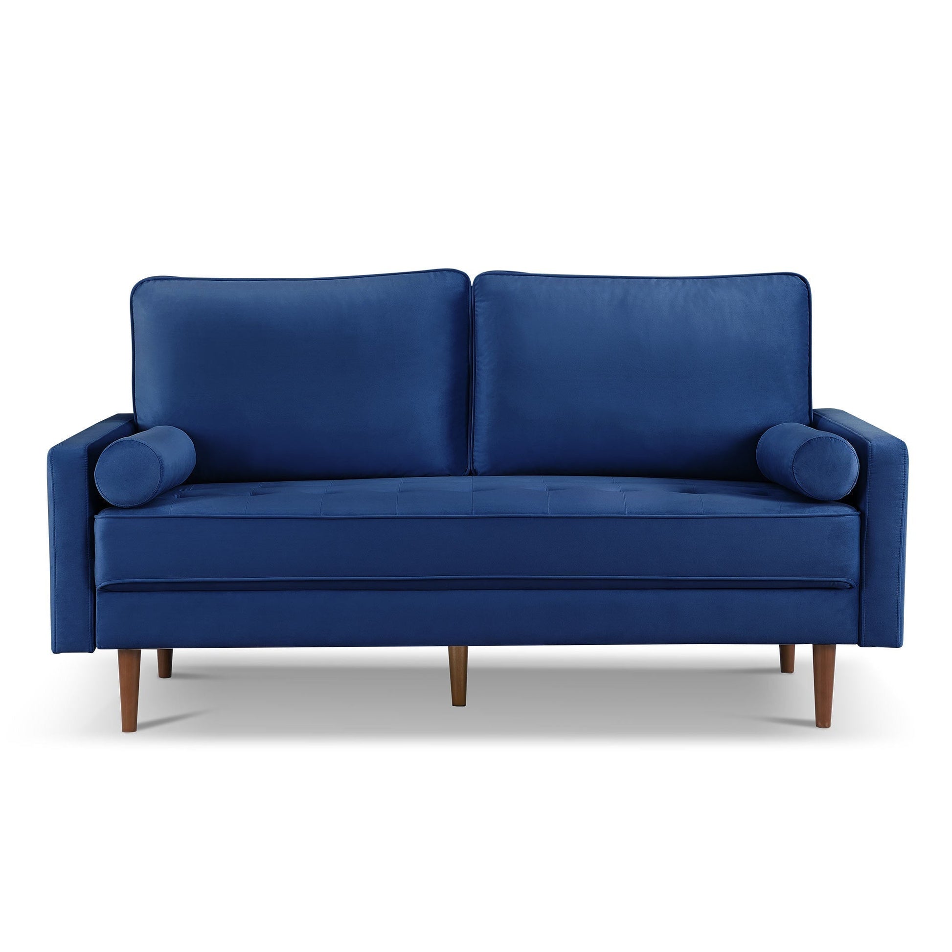 Add an air of fashion to your space with this fabulous 69-inch blue velvet sofa and toss pillows with dark brown legs. This solid color standard is made from sturdy and resilient velvet that has a warm and rich look and is a super soft and comfortable to the touch. Solid colors give you lots of decorative options and are easy to work into your decor scheme. Pocket spring construction gives this piece strong support and makes it comfortable to sit even for long periods of time. Removable back cushions make this sofa easy to manage. Track arms offer a comfy place to rest. The tufted stitching pattern adds visual interest and fine designer detailing. Dark brown solid wood legs effortlessly elevate the room and add a touch of contemporary design. Built to last, this sofa will be a great centerpiece for your room. 37-inch H x 69-inch W x 32-inch D