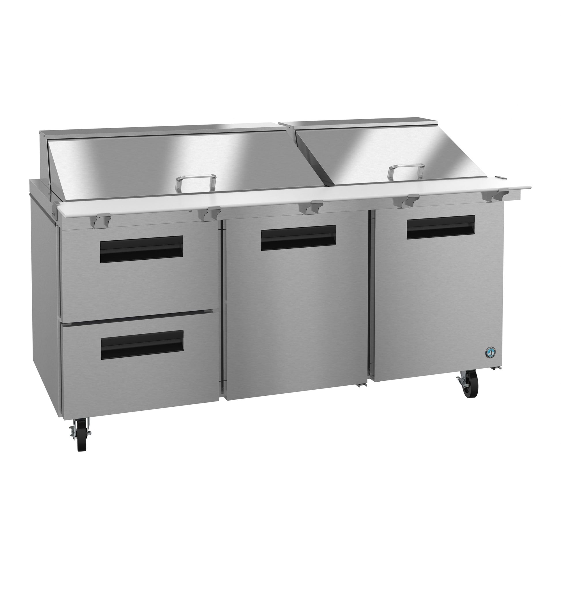 The SR72B-30MD2 also includes (2) epoxy coated wire shelves and (2) stainless steel drawers each with (1) divider bar, (4) 6″ stem casters (2 with brakes) are standard, plus a the drawer slides are constructed of 16 gauge stainless steel with durable acetal rollers. Electrical consumption of 5.05 kWh/day at 4 Amps, 10 ft long cord with a 5 – 15P NEMA plug. 72″ x 10″ x 0.5″ thick white polyethylene cutting board is standard. The unit is ETL Safety (US & C) Listed, ETL Sanitation, Georgia Made Certified and includes a six years parts warranty, five years labor warranty, and seven years compressor warranty.