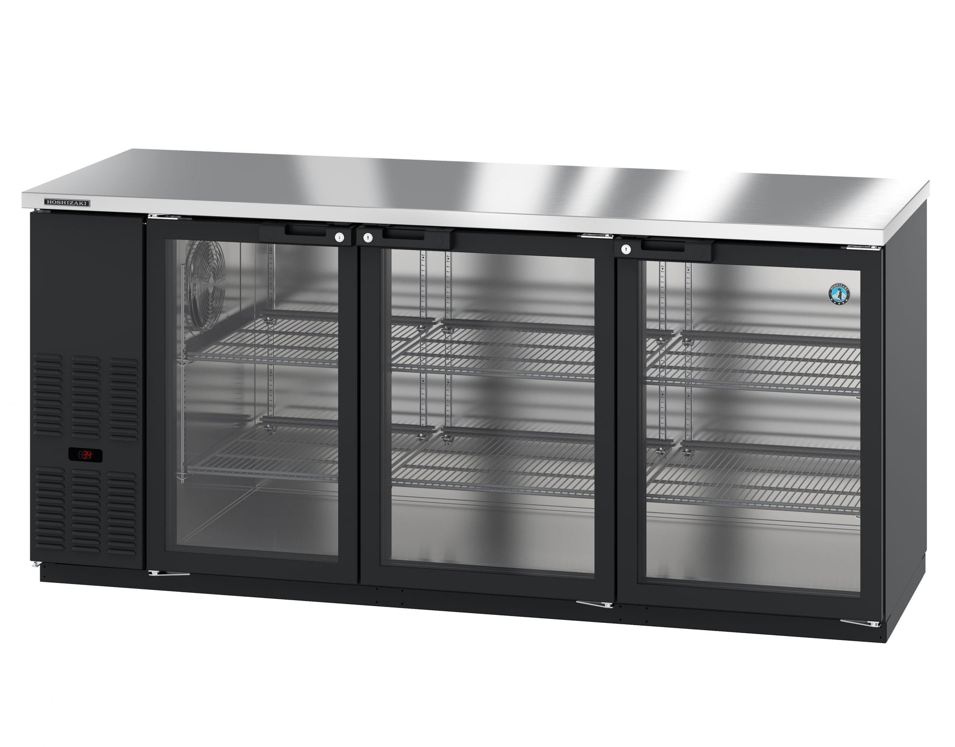 The Hoshizaki BB80-G is an 80" wide, 3-glass door black vinyl back bar cooler built for high-capacity beverage storage.