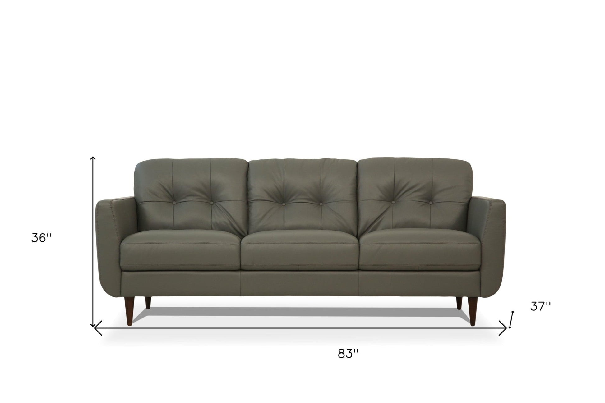 An interior designer's dream, this buttery soft high grade leather 83-inch green leather sofa with black legs will bring just the right touch to your space. The premium leather used makes your lounging luxuriously comfortable and adds an elegant appeal to your space. Solid colors give you lots of decorative options and are easy to work into your decor scheme. Sinuous springs construction gives this piece strong support and makes it comfortable to sit even for long periods of time. Square arms offer a comfy place to rest. The tufted stitching pattern adds visual interest and fine designer detailing. Built to last, this sofa will be a great centerpiece for your room. 36-inch H x 83-inch W x 37-inch D