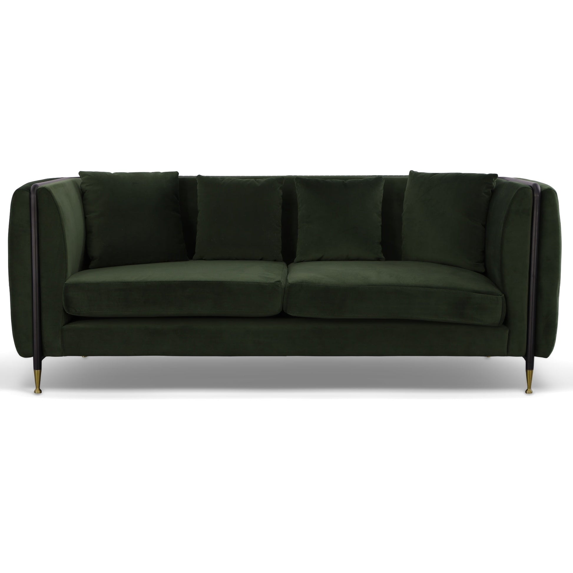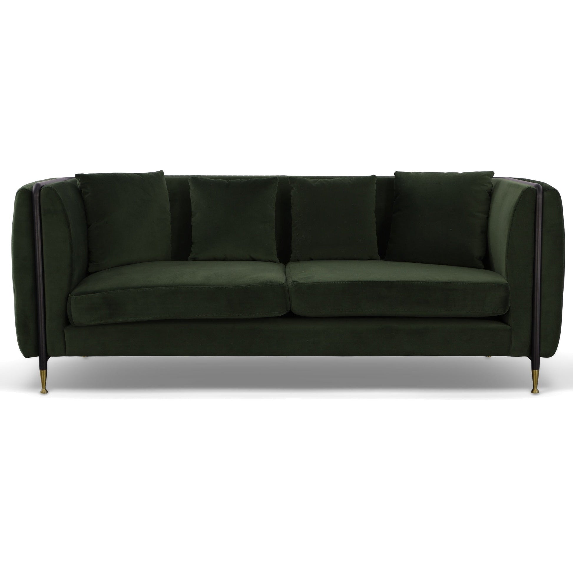 A: This luxurious sofa features rich dark green velvet upholstery, stylish black and gold legs, offering a perfect blend of comfort and modern sophistication for your living room.