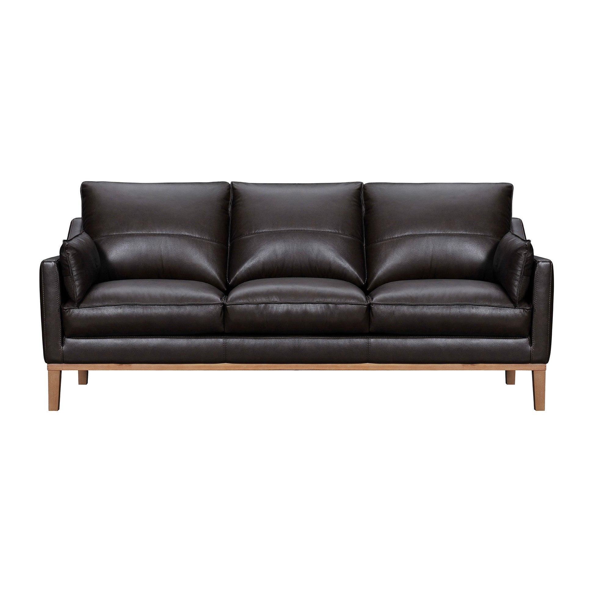 Superior construction from fabulously soft and high grade leather gives this 87-inch dark brown leather sofa and toss pillows with brown legs a leg up on the competition. The premium leather used makes your lounging luxuriously comfortable and adds an elegant appeal to your space. Solid colors give you lots of decorative options and are easy to work into your decor scheme. Web suspension construction gives this piece strong support and makes it comfortable to sit even for long periods of time. Removable seat cushions make this sofa easy to manage. Track arms offer a comfy place to rest. Built to last, this sofa will be a great centerpiece for your room. 37-inch H x 87-inch W x 37-inch D