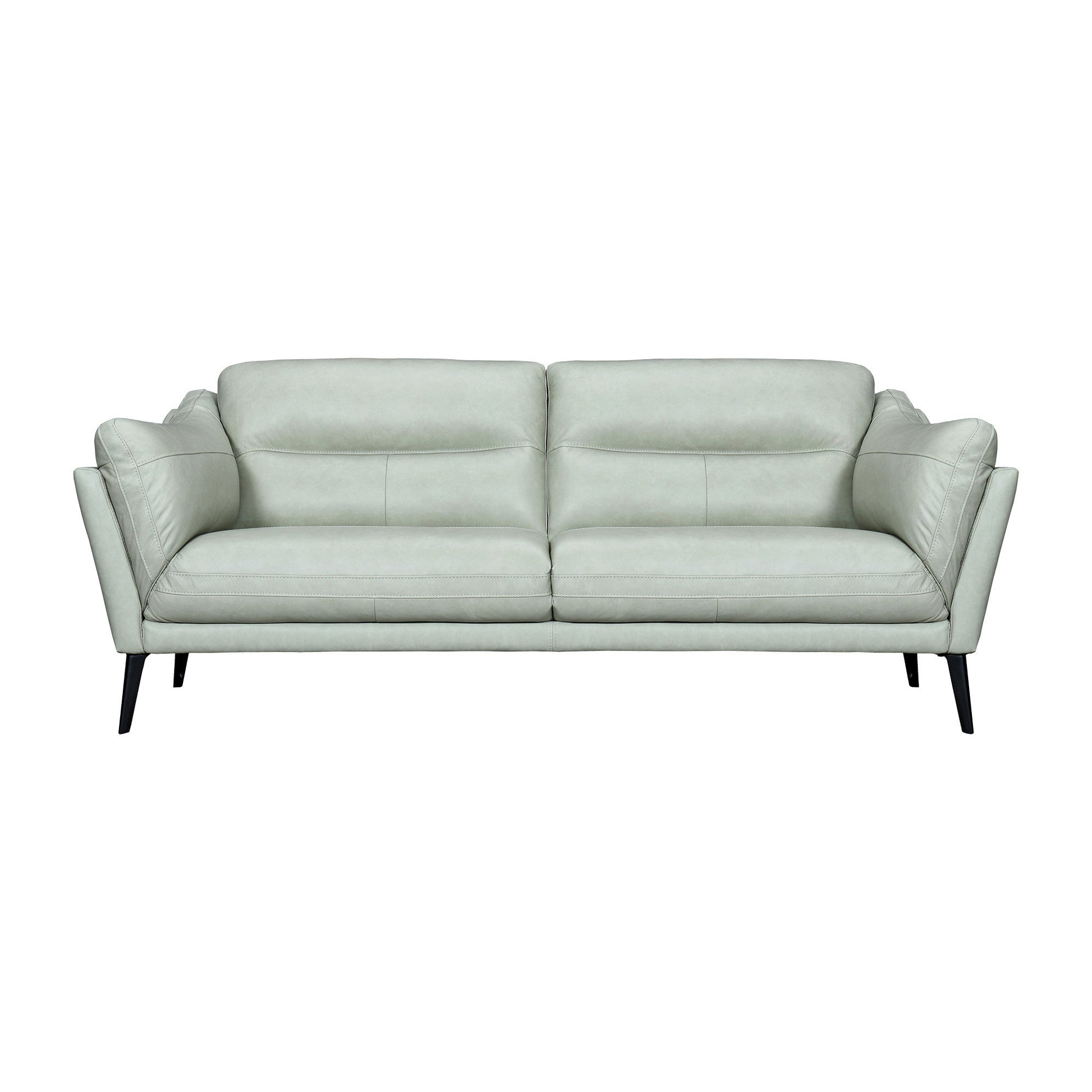 An interior designer's dream, this buttery soft high grade leather 87-inch mint green leather sofa with black legs will bring just the right touch to your space. The premium leather used makes your lounging luxuriously comfortable and adds an elegant appeal to your space. Solid colors give you lots of decorative options and are easy to work into your decor scheme. Web suspension construction gives this piece strong support and makes it comfortable to sit even for long periods of time. Flared arms offer a comfy place to rest. Black metal legs effortlessly elevate the room and add a touch of contemporary design. A great showpiece for your room, this sofa is a must have. 35-inch H x 87-inch W x 38-inch D