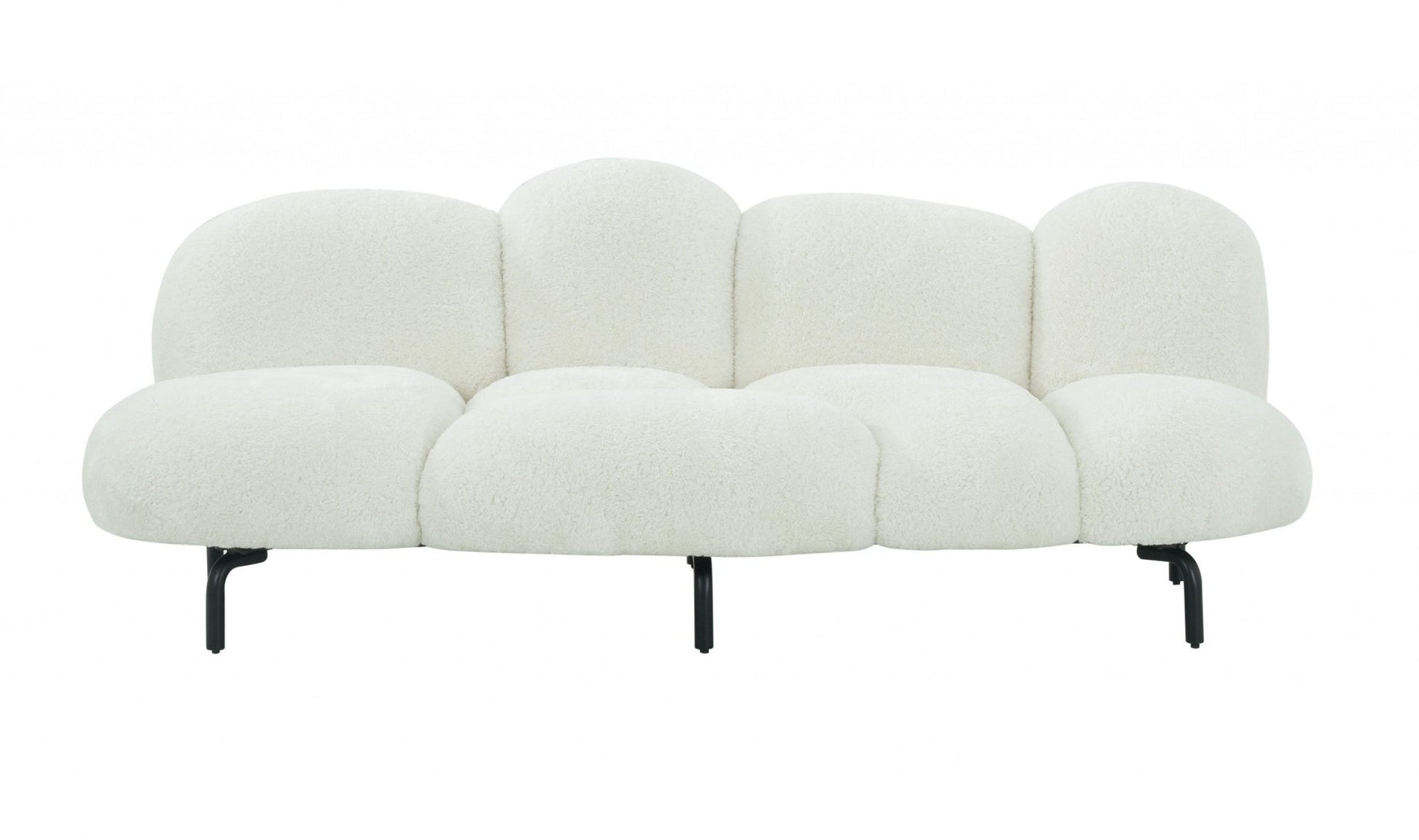 A: This sleek and modern sofa features soft white upholstery, complemented by black metal legs, combining contemporary style and comfortable seating for any room.