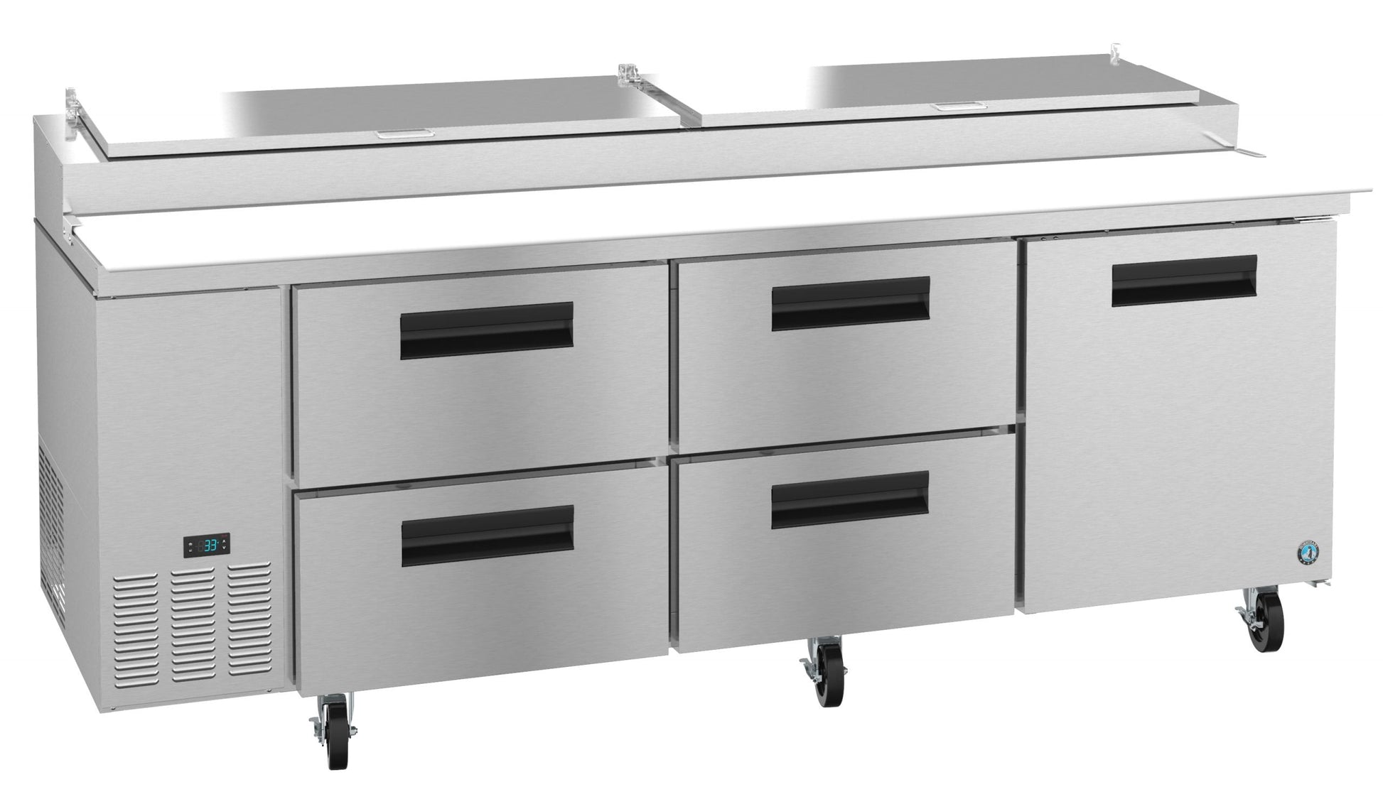 The PR93A-D4 Steelheart Series Pizza prep table, three section refrigerator with drawer/door combo. Engineered to maintain food safe temperatures in 100°F ambient conditions and with a net capacity of 30 cubic feet this front breathing prep table refrigerator is the right choice for hot kitchens. It features an adjustable ducted rail air distribution system to suit any kitchen.