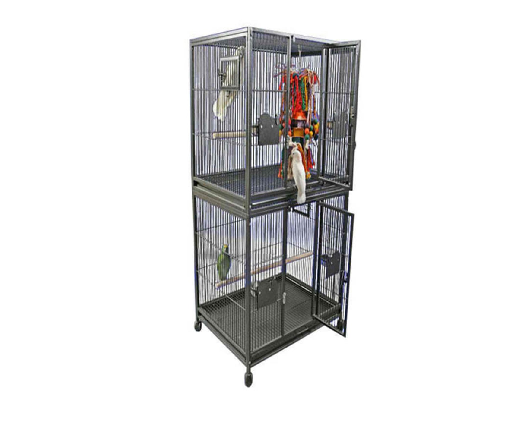 The double-sized cage offers larger species all the room they require, as well as a wide range of entertainment options and ideal living health. Your bird's safety is never in doubt thanks to front doors and feeder doors that are bird-proof. Your elegantly colored cage is also tested to be completely non-toxic for birds.