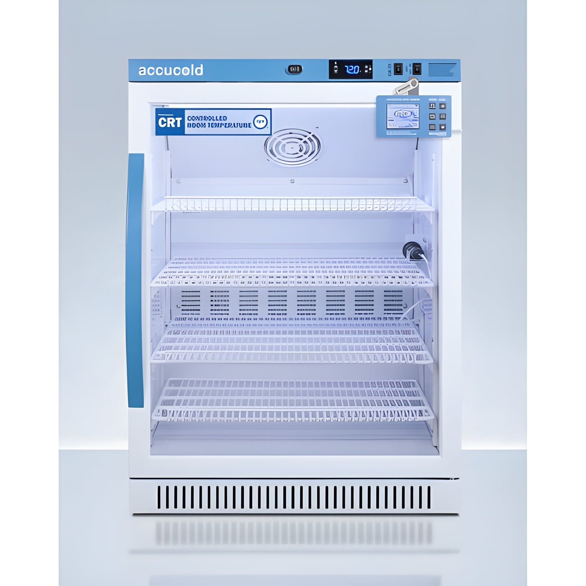 Performance Series Controlled Room Temperature CabinetThe ARG6PV-CRT is a 6 cu.ft. upright storage unit designed for stable room temperature medication storage. Pre-set to 72ºF, it offers an adjustable range from 68º to 77ºF, making it ideal for ADA-compliant applications. A microprocessor temperature controller is externally located to reduce door openings, while a buffered temperature probe encased in a glycol-filled bottle ensures precise temperature simulation. Audible and visual alarms alert users to temperature fluctuations, power failures, or sensor issues. Optimized forced air cooling and adjustable cycle defrost maintain stability, while adjustable wire shelves offer flexible storage. The double-pane tempered glass door features a self-closing function, a factory-installed lock with two keys, and a user-reversible swing. A hospital-grade cord with a 'green dot' plug enhances safety. The unit’s antimicrobial handle, white powder-coated metal interior, and LED lighting contribute to a cleaner, more durable design for high-traffic environments.