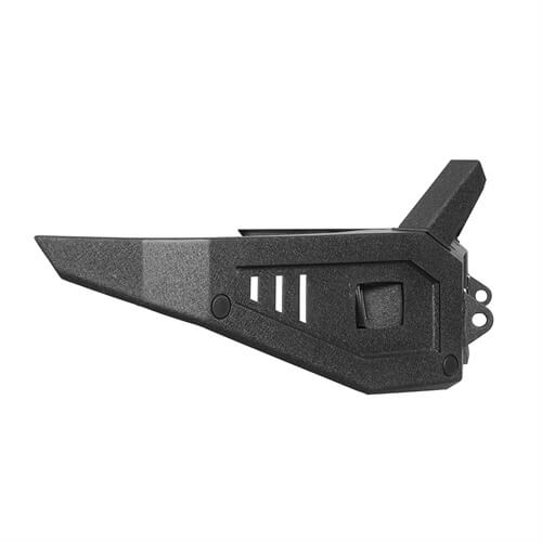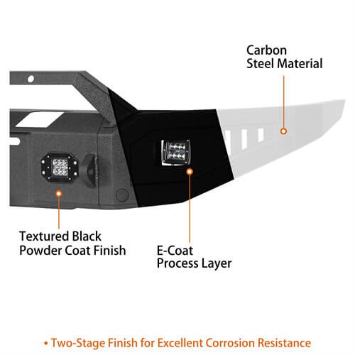 Heavy Duty Structure. The main body of the bumper is crafted from heavy-duty, high tensile 11-gauge (1/8 inch) steel. The winch plate is made from 8-gauge (11/64 inch) steel. This robust material provides strength and resilience to withstand impacts and off-road challenges. The bumper is coated with a textured black powder coat finish on the exterior. Inside a premium E-coating process is applied. This combination of exterior and interior finishes provides both strength and protection against various environmental factors.