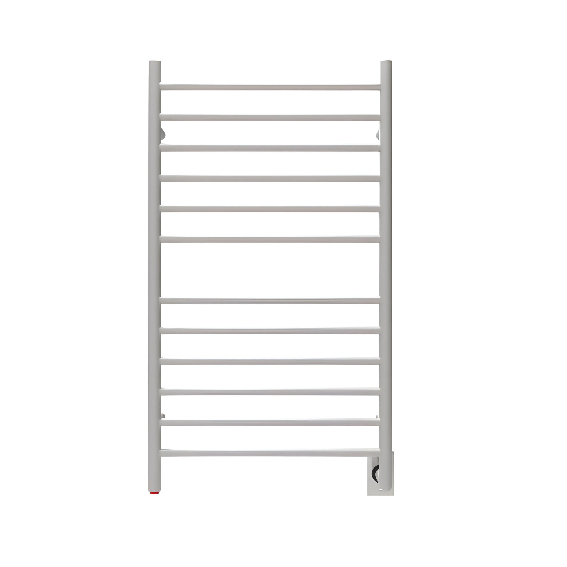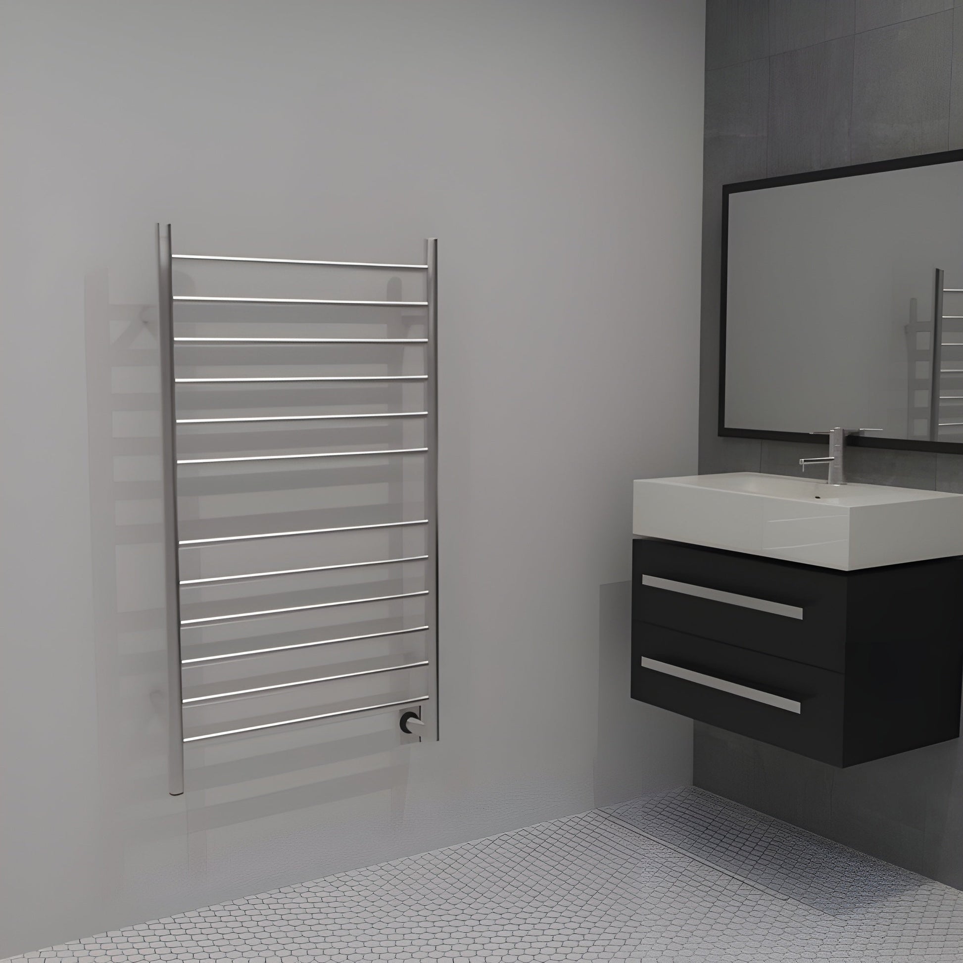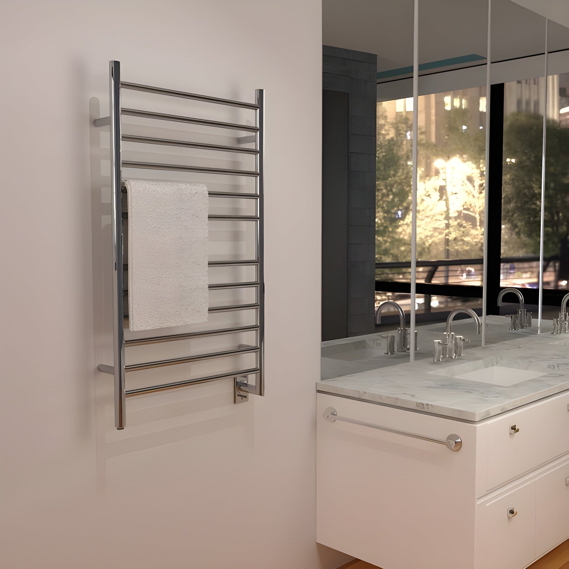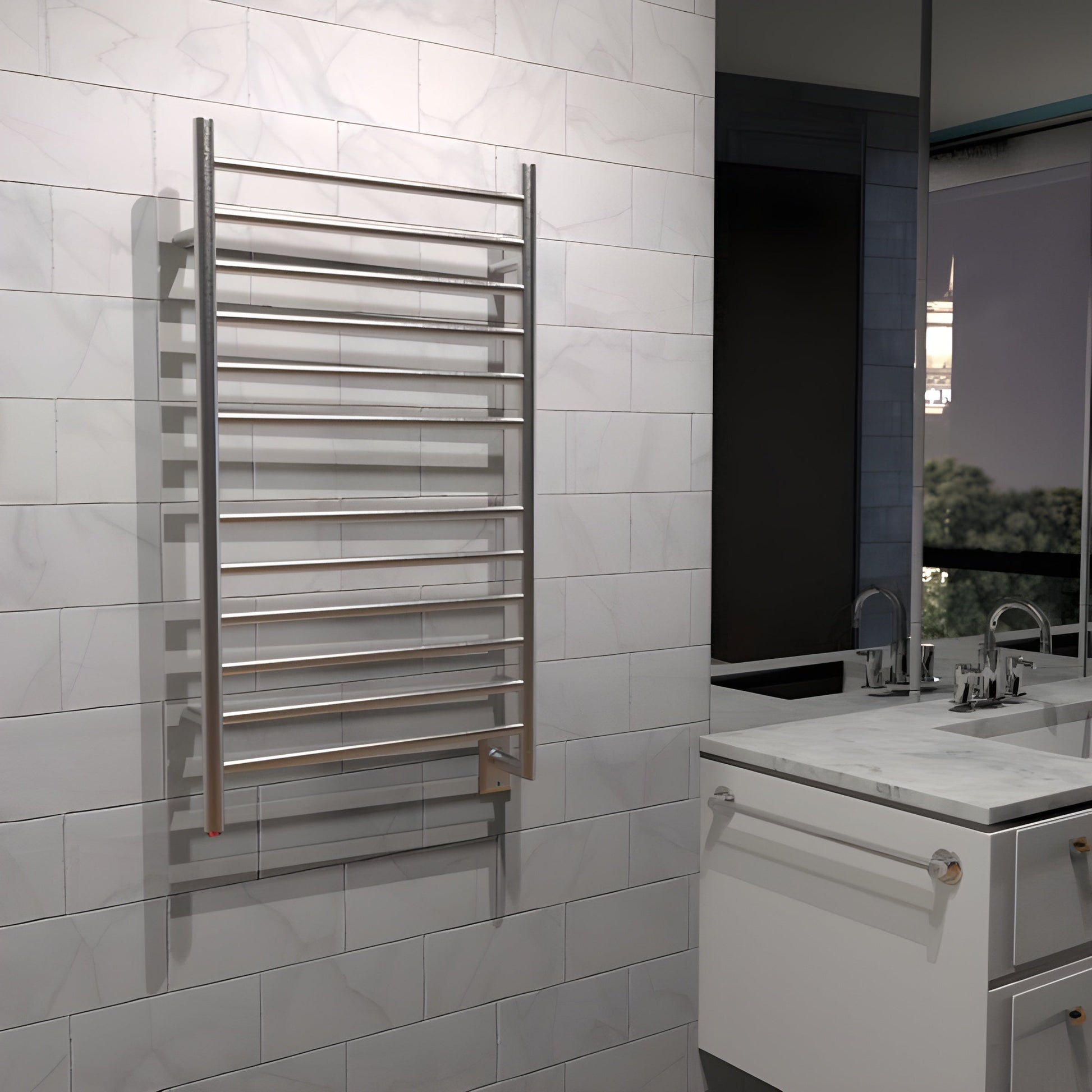 A: This model features straight bars for optimal towel placement, durable stainless steel construction, energy-efficient heating elements, and a hardwired installation for seamless integration into your bathroom.