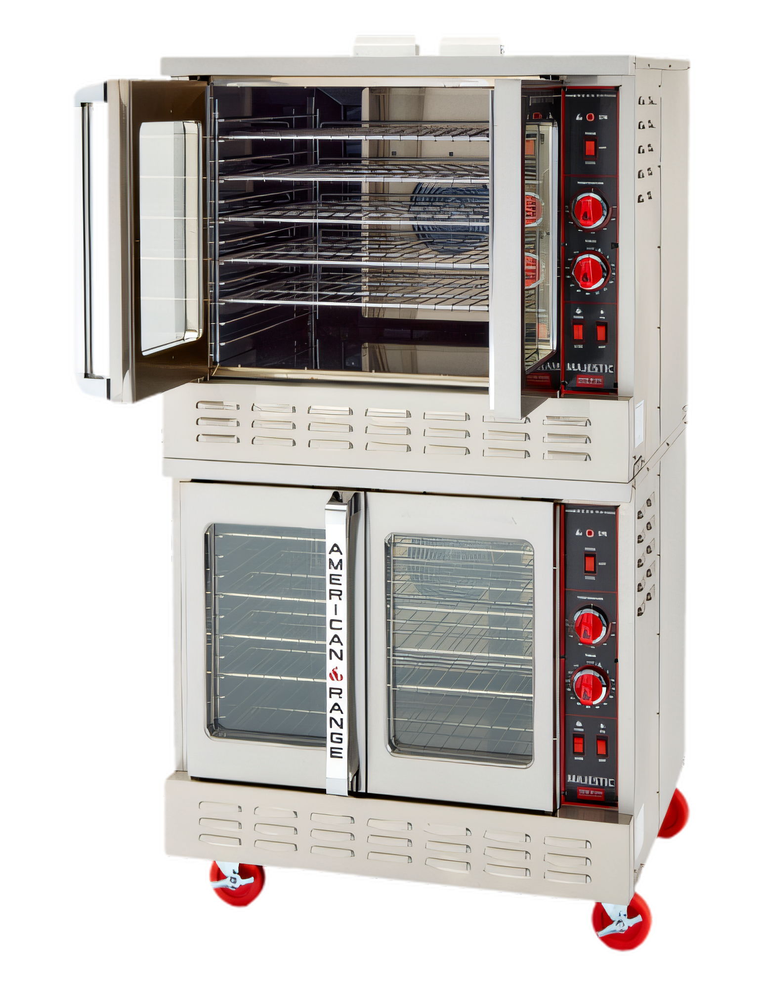 Built for bustling commercial kitchens, the American Range Majestic double-deck convection oven delivers the throughput, precision and durability professionals demand—all in a compact 40 inch footprint. Two independent 50/50 glass-panel doors invite chefs to monitor product at a glance, while twin 2-speed blower motors blanket every rack with consistent, even heat.