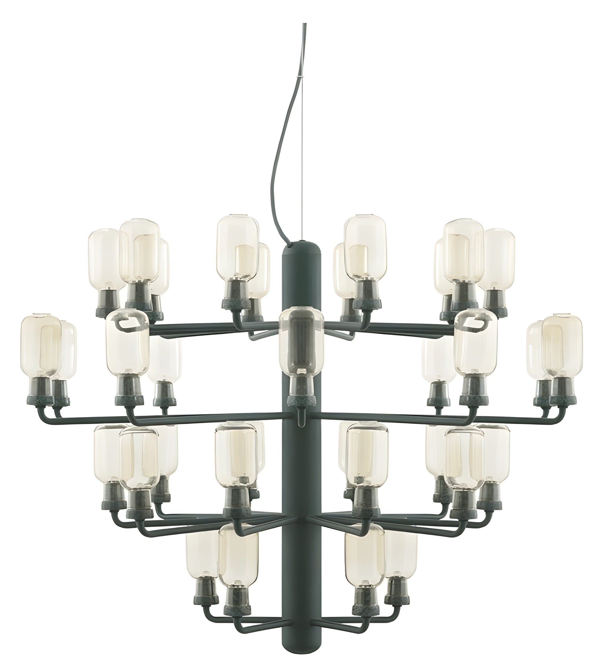 The Amp Chandelier by Normann Copenhagen is a striking mix of classic and modern design. Inspired by 1960s tube amplifiers, designer Simon Legald used glass shades and solid marble accents to create a refined look. Its sculptural shape gives off a nostalgic yet contemporary feel. Available in multiple colors, it blends seamlessly into a modern lighting setup.
