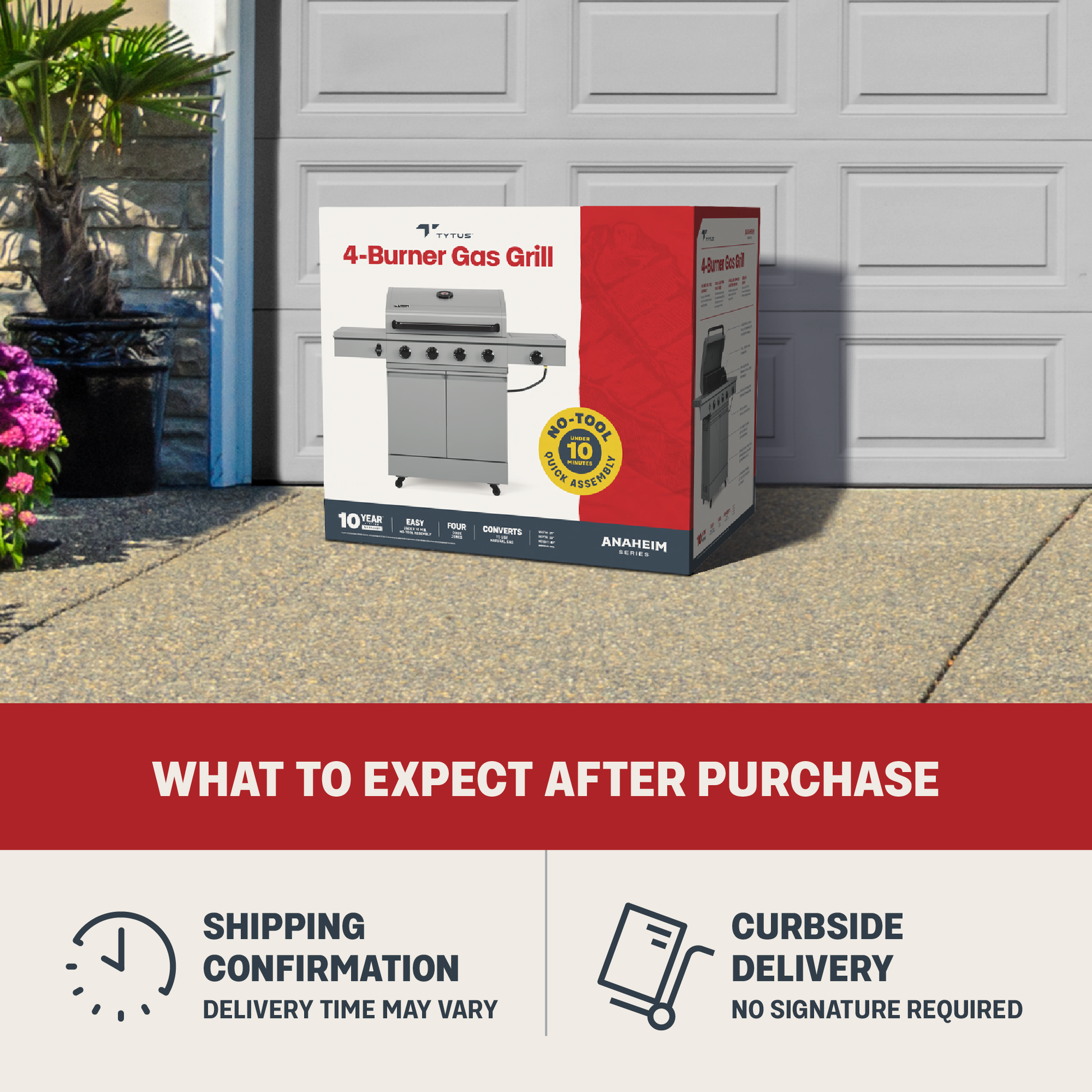 The TYTUS Anaheim 4-Burner Gas Grill is your go-to grill, whether you're just starting out or a seasoned pro. Our patented no-tool assembly gets you grilling in minutes while durable construction provides years of outdoor cooking adventures. A generous 721 square inches of cooking area on porcelain-enameled cast iron grates is powered by stainless steel burners to sear, warm, and cook for any crowd. A 12,000 BTU side burner, side table and 8.2 cubic feet of enclosed storage add convenience and flexibility. Link to the TYTUS Emberwood Grill & Prep cart for more prep space or to add an Emberwood griddle, pellet smoker or pizza oven for endless grilling possibilities.
