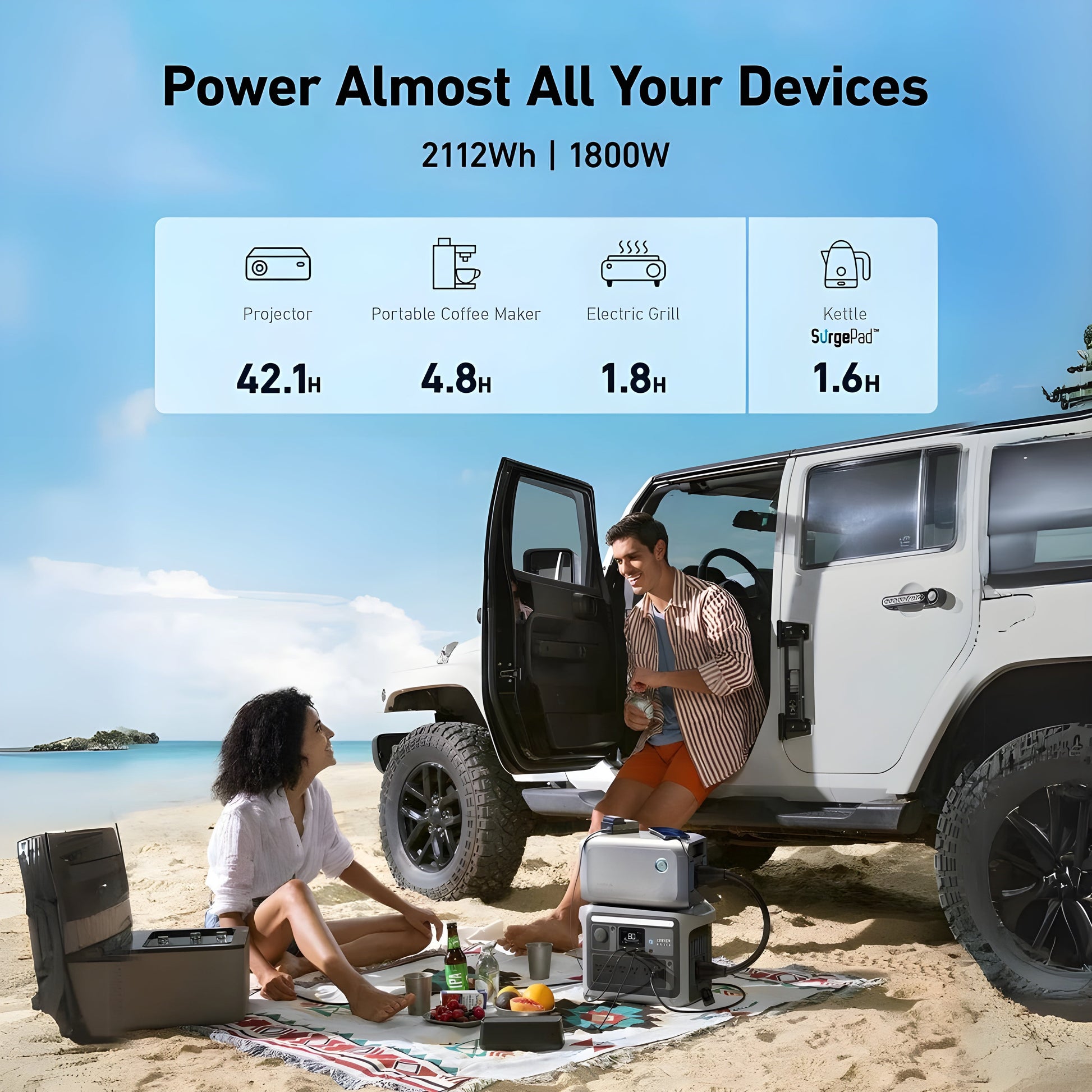 A: A compact yet powerful 1056Wh, 1800W portable power station designed for home backup, outdoor adventures, and emergency power needs.