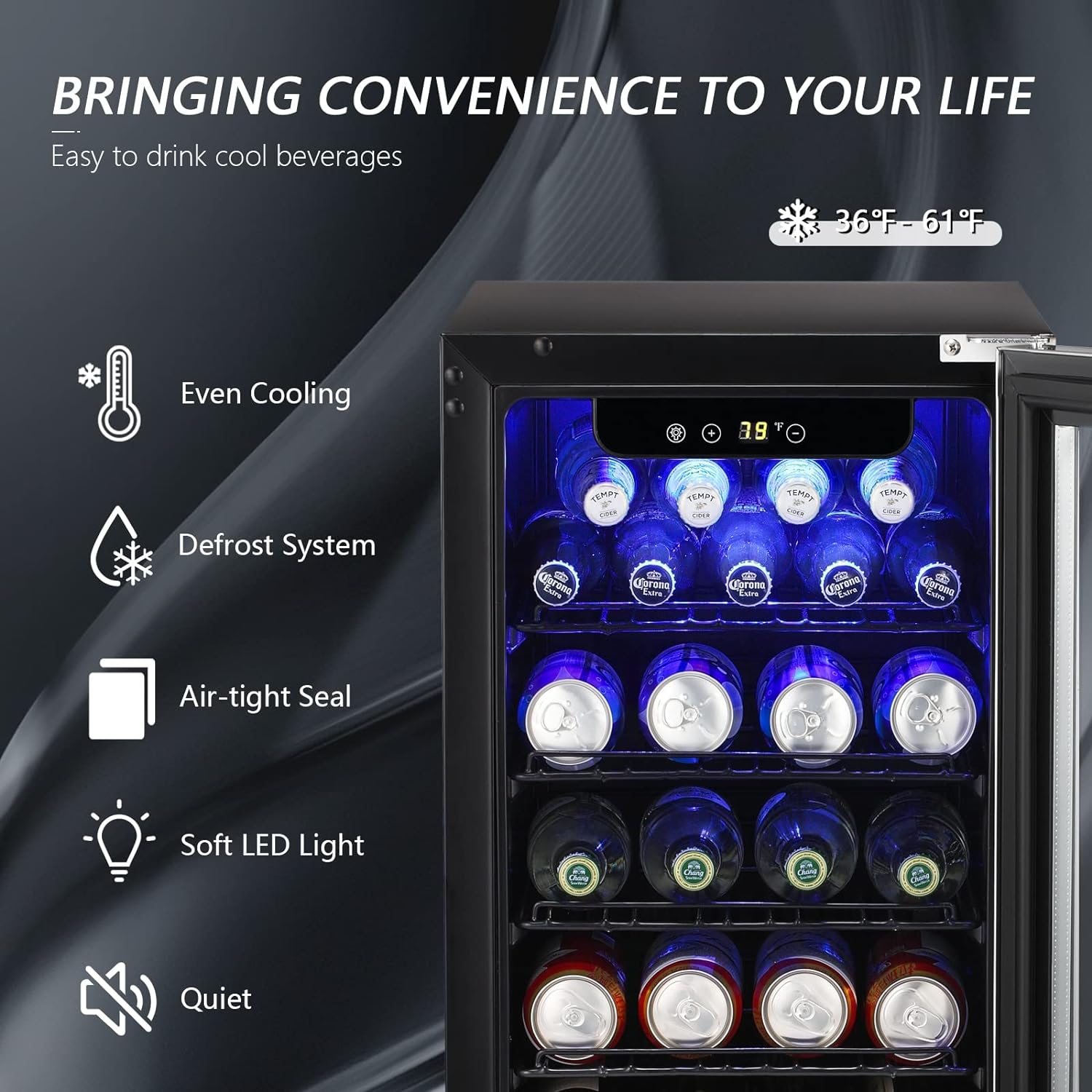 - COMPACT BEVERAGE COOLER: This refrigerator can keep a variety of canned drinks or wine perfectly chilled without taking up too much space in your home, dorm, bar, or office. Its advanced design adapts to the high-quality needs of different spaces and users.