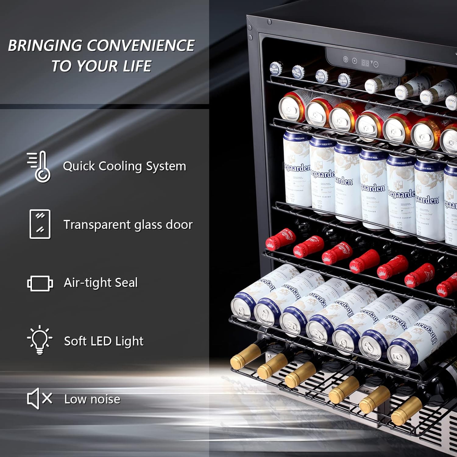 A: A spacious and stylish beverage cooler designed for efficient chilling, perfect for home bars, offices, kitchens, and entertainment spaces.