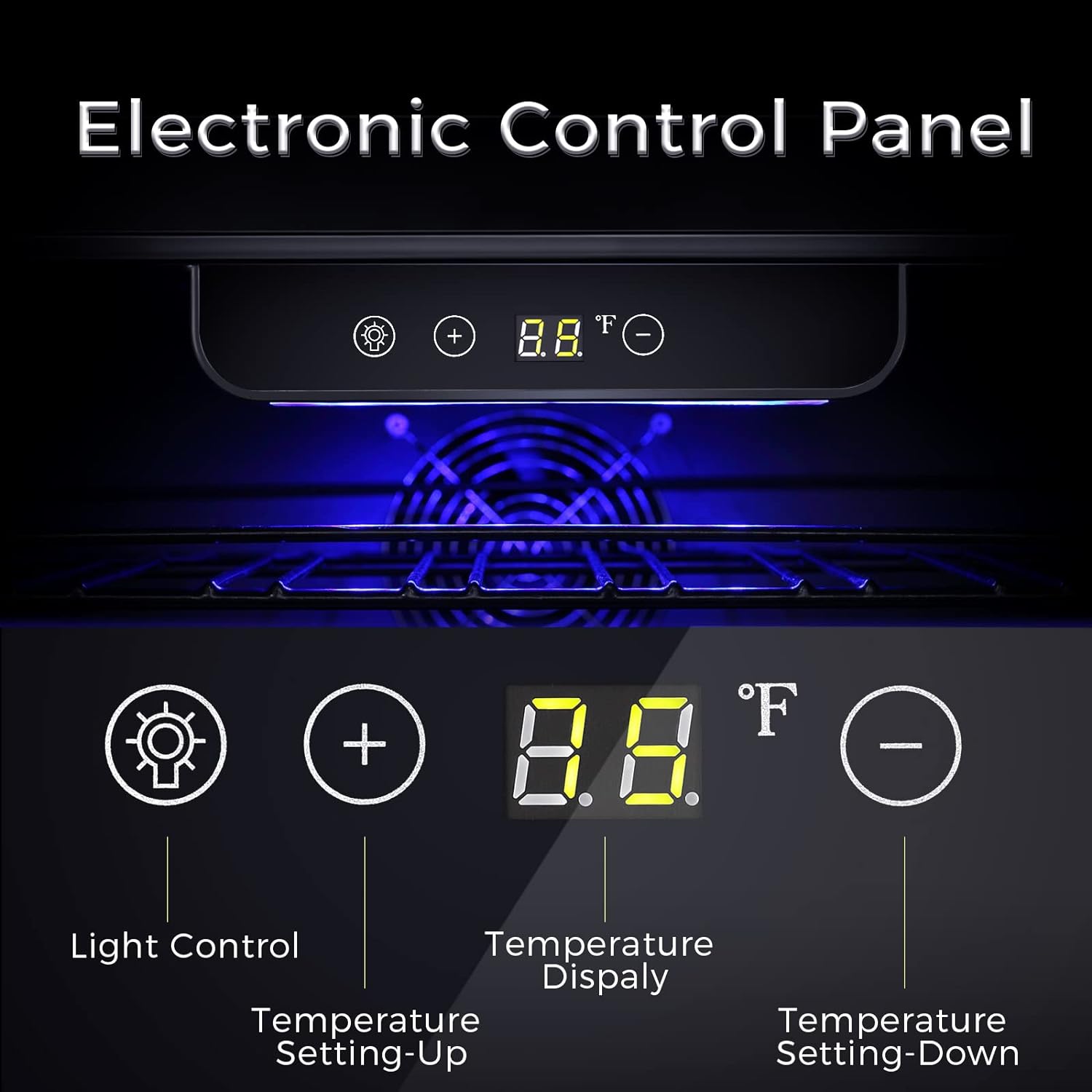 - 46 BOTTLE CAPACITY: This wine cooler can hold 46 bottles of your favorite wine in various sizes. The spacious interior eliminates the need to remove any shelf to fit different types and sizes of wine. With dimensions of W 23.42" x D 22.76" x H 34.25", it saves a lot of space. Blue LED lights provide a clear view of the interior wine collection.
