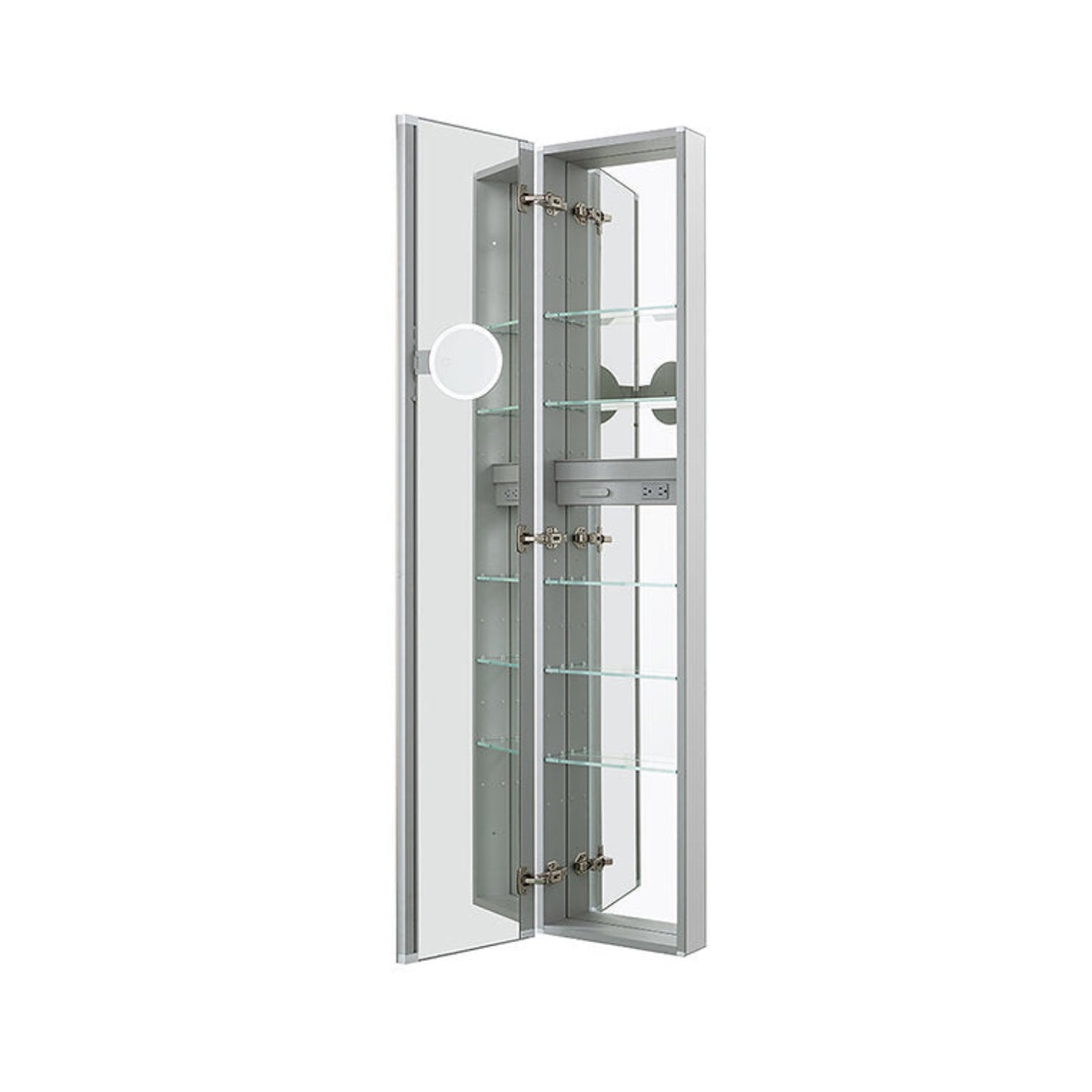 Replete with numerous design elements that Aquadom is renowned for, The Royale will elevate your bathroom s look. This superior cabinet comes with popular style elements including 8mm clear adjustable glass shelves, allowing for customized arranging to suit individual needs, magnetic organization, a built-in, removable, LED-lit 3X magnifying mirror that is vertically adjustable and flips out flat, accommodating users of varying heights, convenient electrical outlets and of course, Aquadoms famous soft close hinges that allow for gentle and secure opening and closing at a wide angle of 155 degrees and side paneled mirrors are included for surface mount.