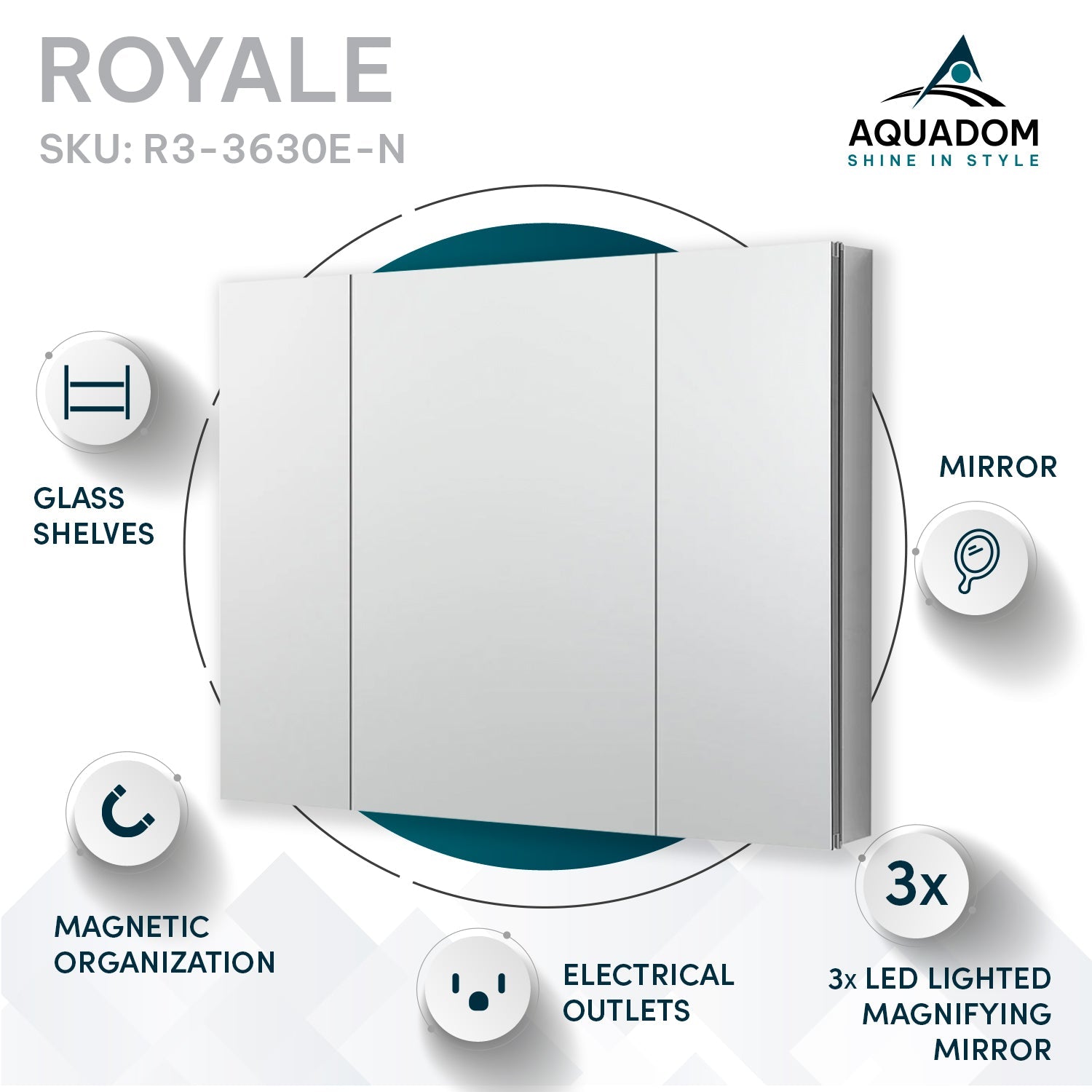 Replete with numerous design elements that Aquadom is renowned for, The Royale will elevate your bathroom s look. This superior cabinet comes with popular style elements including 8mm clear adjustable glass shelves, allowing for customized arranging to suit individual needs, magnetic organization, a built-in, removable, LED-lit 3X magnifying mirror that is vertically adjustable and flips out flat, accommodating users of varying heights, convenient electrical outlets and of course, Aquadoms famous soft close hinges that allow for gentle and secure opening and closing at a wide angle of 155 degrees and side paneled mirrors are included for surface mount.