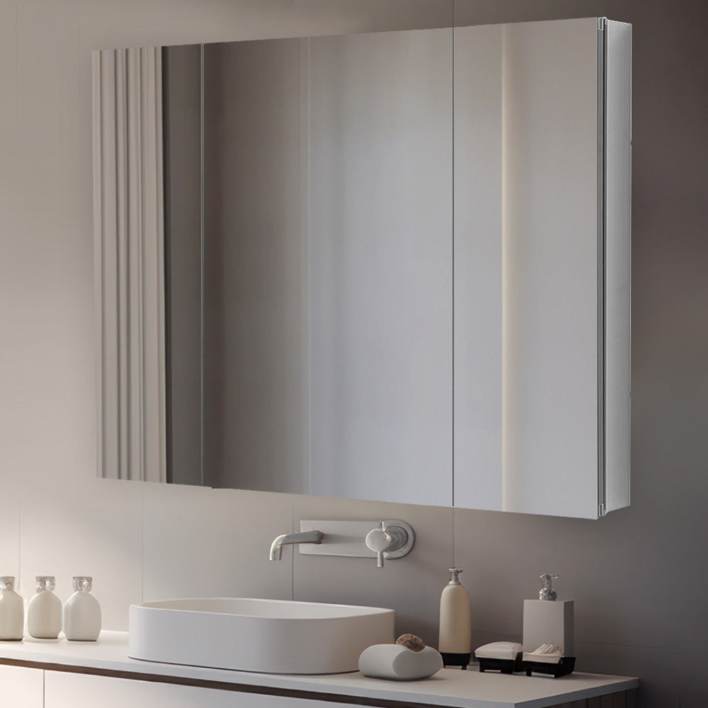 A: A 36" x 30" rectangular triple‑door medicine cabinet that can be recessed or surface mounted for versatile bathroom installation.