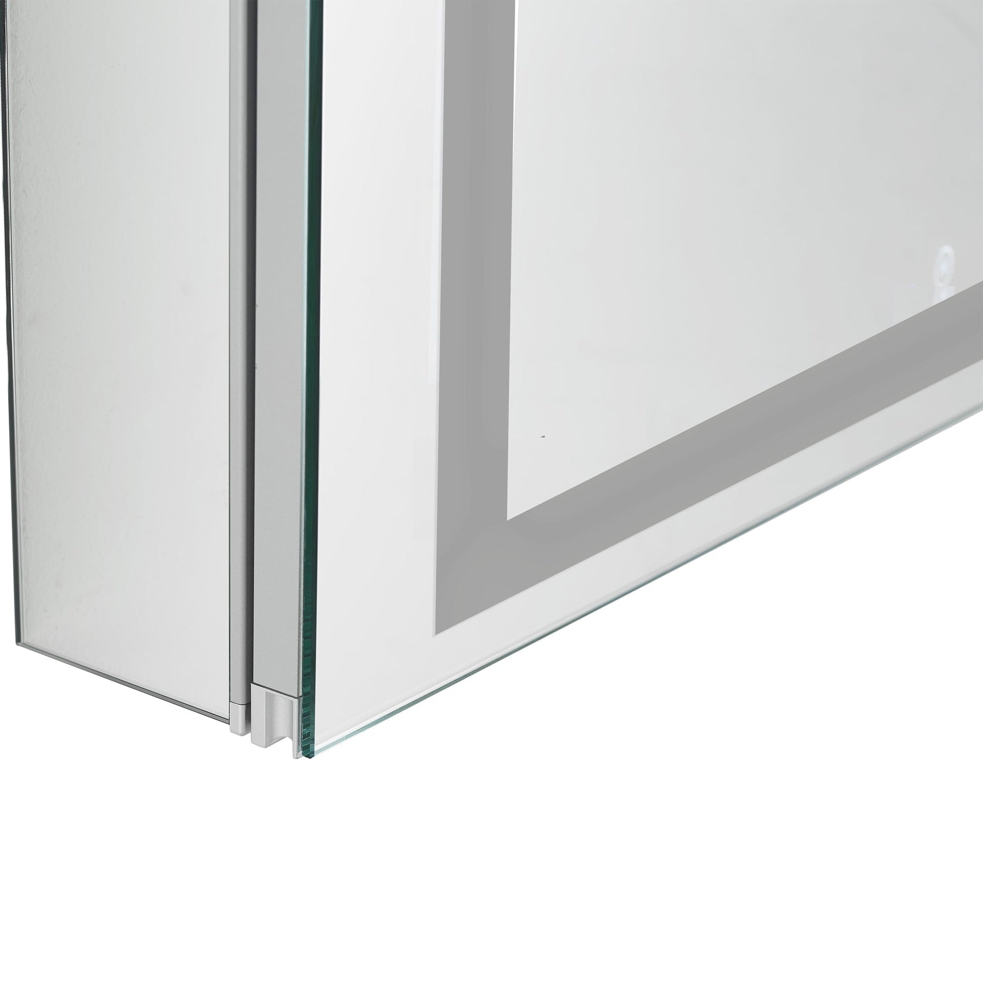 Constructed from high quality aluminum which is rust proof. Equipped with cool temperature LED dimmable lights on the mirrored doors which are attached by 155-degree soft close hinges, and an interior electrical outlet on the inside of the cabinet and Defogger.