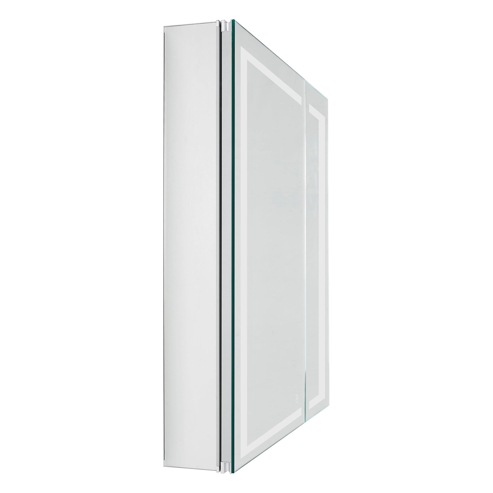 Constructed from high quality aluminum which is rust proof. Equipped with cool temperature LED dimmable lights on the mirrored doors which are attached by 155-degree soft close hinges, and an interior electrical outlet on the inside of the cabinet and Defogger.