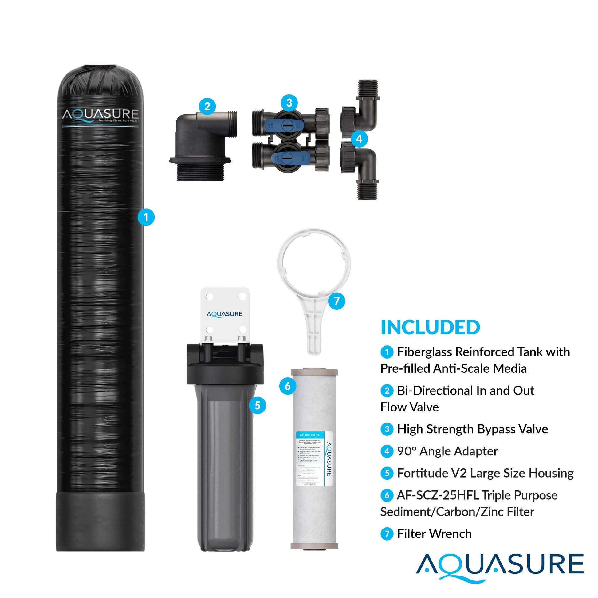 A: It includes a 10 GPM salt-free water conditioning/softening system and a triple-purpose pre-filter for whole-house water treatment.
