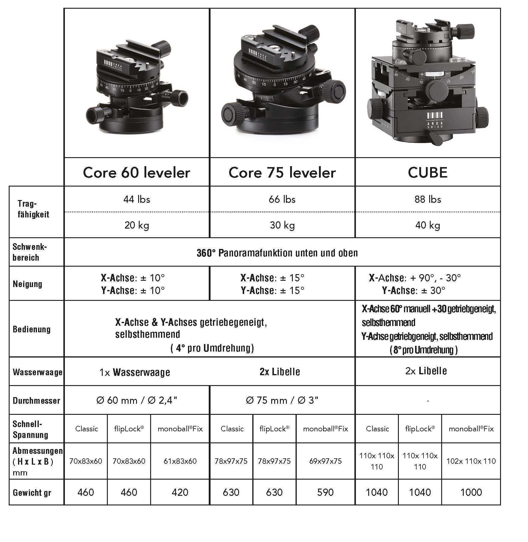 The Core 60 Leveler is a geared tripod head featuring easy handling and quick camera leveling. In addition to base and top panning, the Core 60 Leveler is equipped with micro-metric movements of +/- 10° in the X/Y axes. This compact and versatile tripod head is well suited for architectural, landscape, and travel photographers.