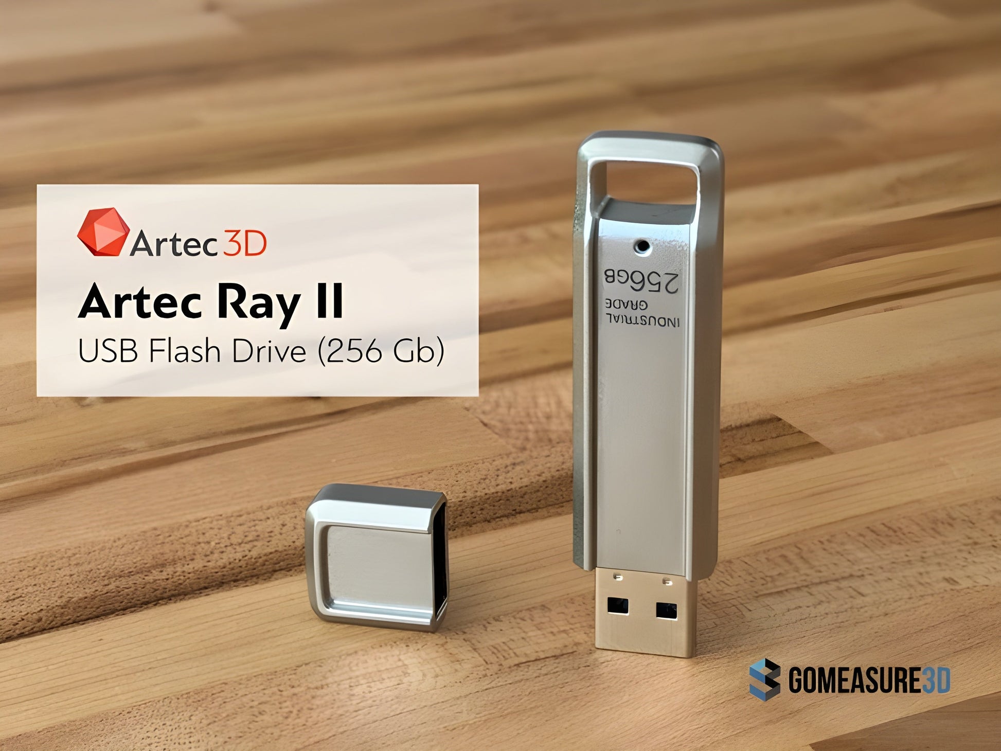 The Artec Ray II 3D scanner utilizes a specialized 256 GB USB 3.0 flash drive (model AS256) for data storage, ensuring efficient handling of large scan files