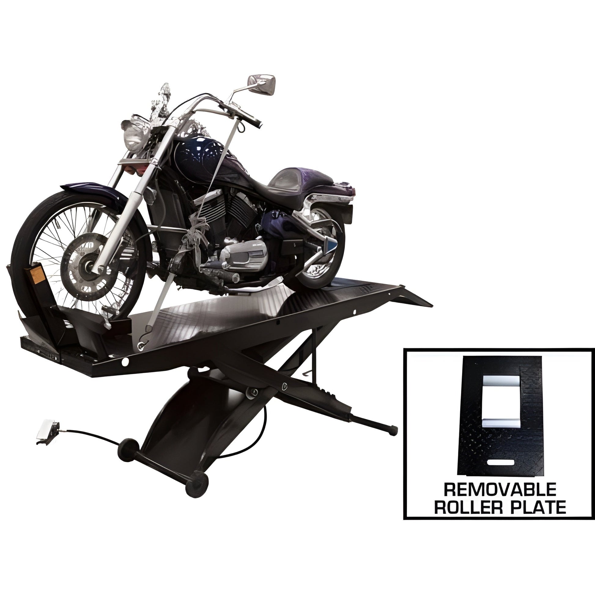 Atlas Air Operated Motorcycle LiftThe Atlas ACL is air operated and requires between 90-100 PSI to operate. The ACL is the perfect addition to any service department of professional motorcycle dealers or is a great motorcycle lift for the person who wants to work on his personal bike in their own garage.This is a complete motorcycle lift that includes an adjustable front (padded) wheel vise and a heavy duty air operated foot valve for easy raising and lowering. The defining feature of the ACL motorcycle lift is a removeable plate at the rear of the lift. The plate can be removed and left off to allow more access to the rear tire or the plate can be replaced with an included roller plate. The roller plate allows the rear tire to be spun for work and testing. Finally the ACL also includes the stabilizing bar at no extra charge. This bar provides greater stability for the raised platform by increasing the footprint of the lift.For those customers looking for more width to pick up ATVs, UTVs, Golf Carts, and other wider vehicles the Atlas ACL motorcycle lift can be equipped with the Atlas ACL Side Extension Kit to increase the width up to 4 feet.
