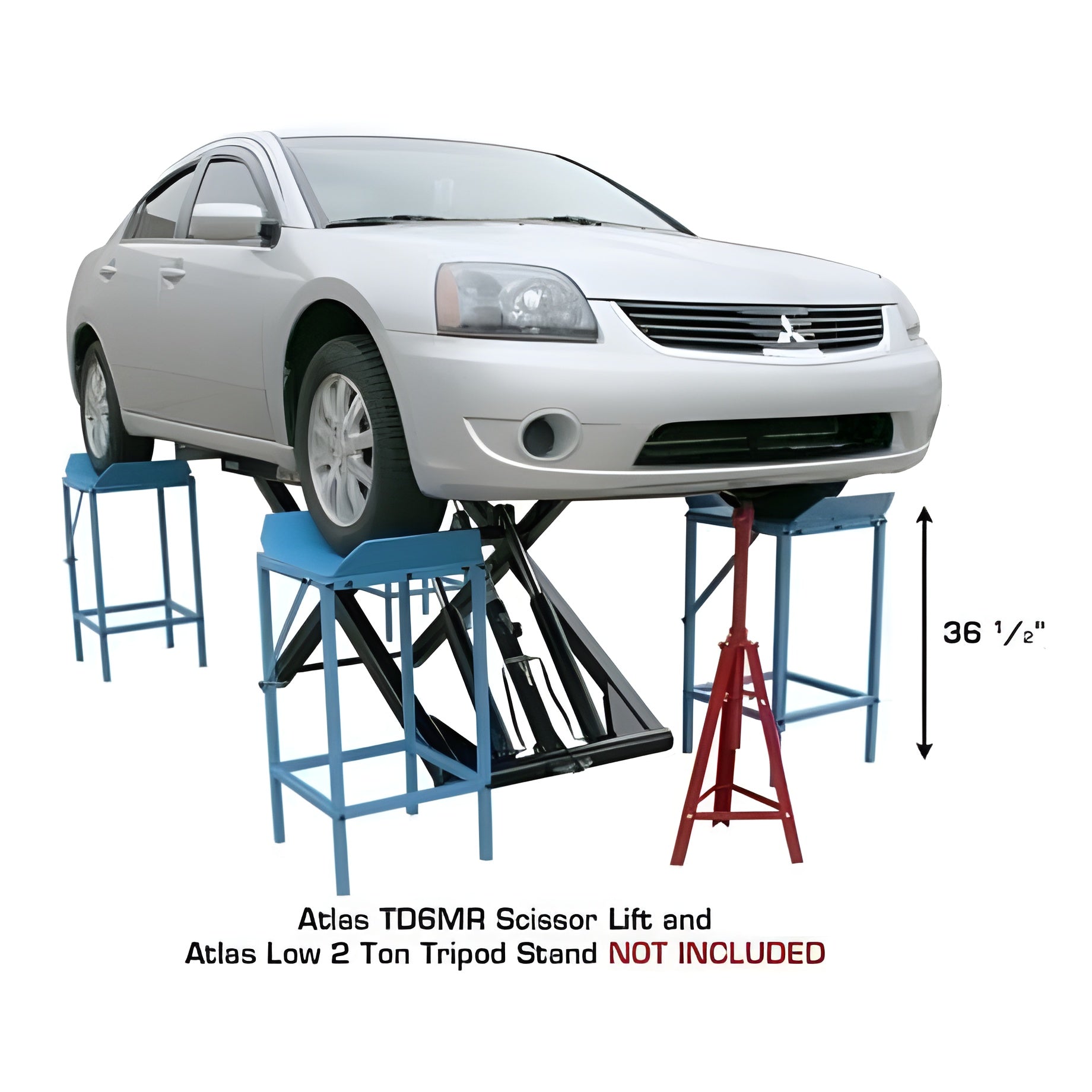 Alignment Wheel Stand PackageThe Atlas Wheel Stands are the perfect choice for those smaller shops who want the advantages of a four post lift but have only limited floor space. The set of Atlas Wheels Stands can support up to 6,000 lbs. and, because they are taller than most other stands, are the perfect height for hanging wheel alignment sensors. Many shops do not have room for a dedicated four post alignment lift. These shops may have only two post lifts or midrise lifts in their existing facility. The Atlas Wheel Stands can be adjusted (leveled) so that they can be used for wheel alignment. Simply place a turntable on each wheel stand and your two post lift has been transformed into a four post alignment lift. Use the arms of your two post lift (or mid-rise lift) to raise the vehicle to perform lateral run-out compensation for your sensors or to make adjustments on the front or rear ends. The Atlas Wheel Stands are also perfect for undercar service including exhaust and suspension adjustments and installations.The Atlas Wheel Stands are the perfect choice for those two post lift owners who also want the many advantages offered by a four post lift, but just do not have the extra shop space.