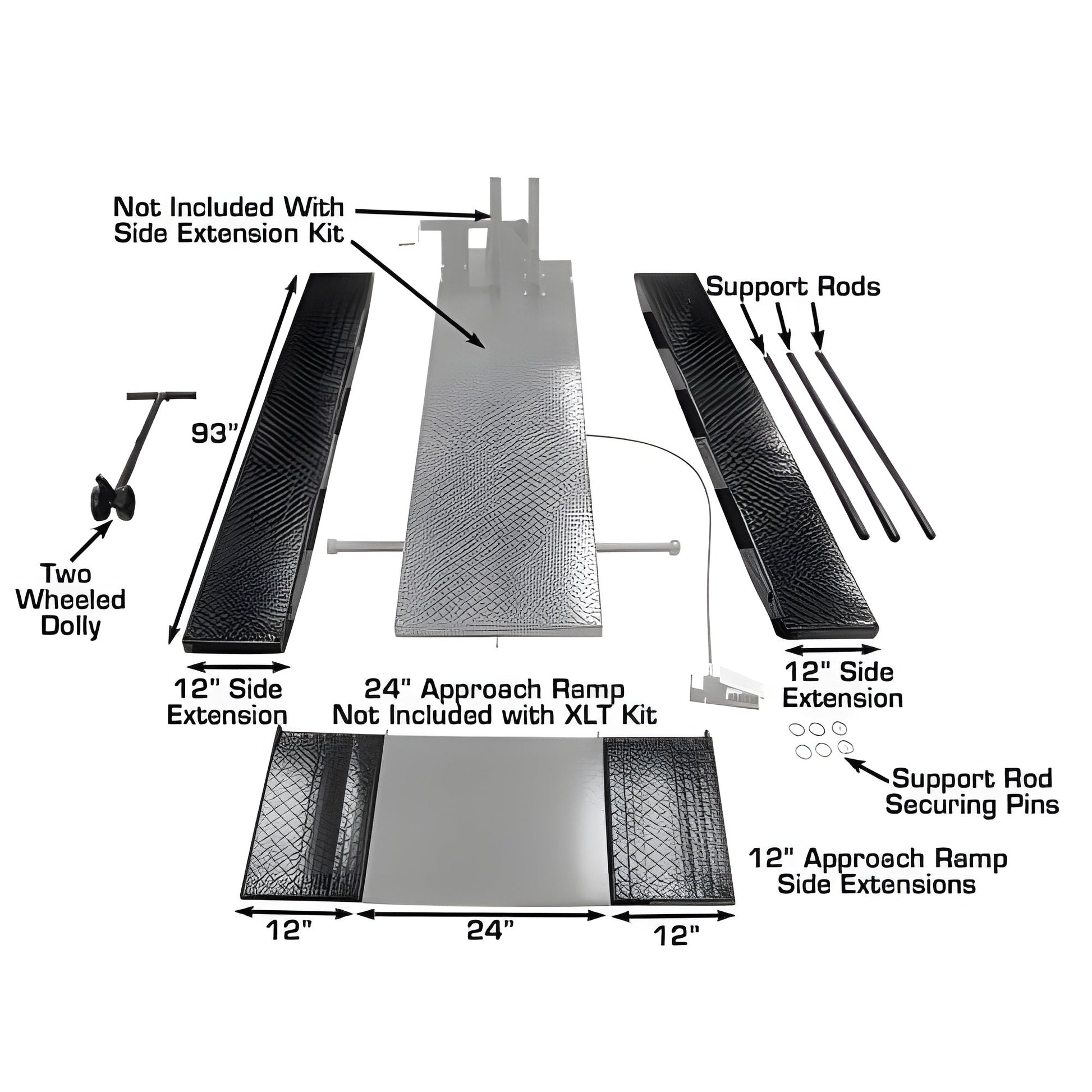 The Atlas Cycle Lift XLT Side Extension Kit includes two 12″ wide side extensions, a two wheeled dolly, approach ramp extensions, three connector rods and clips.