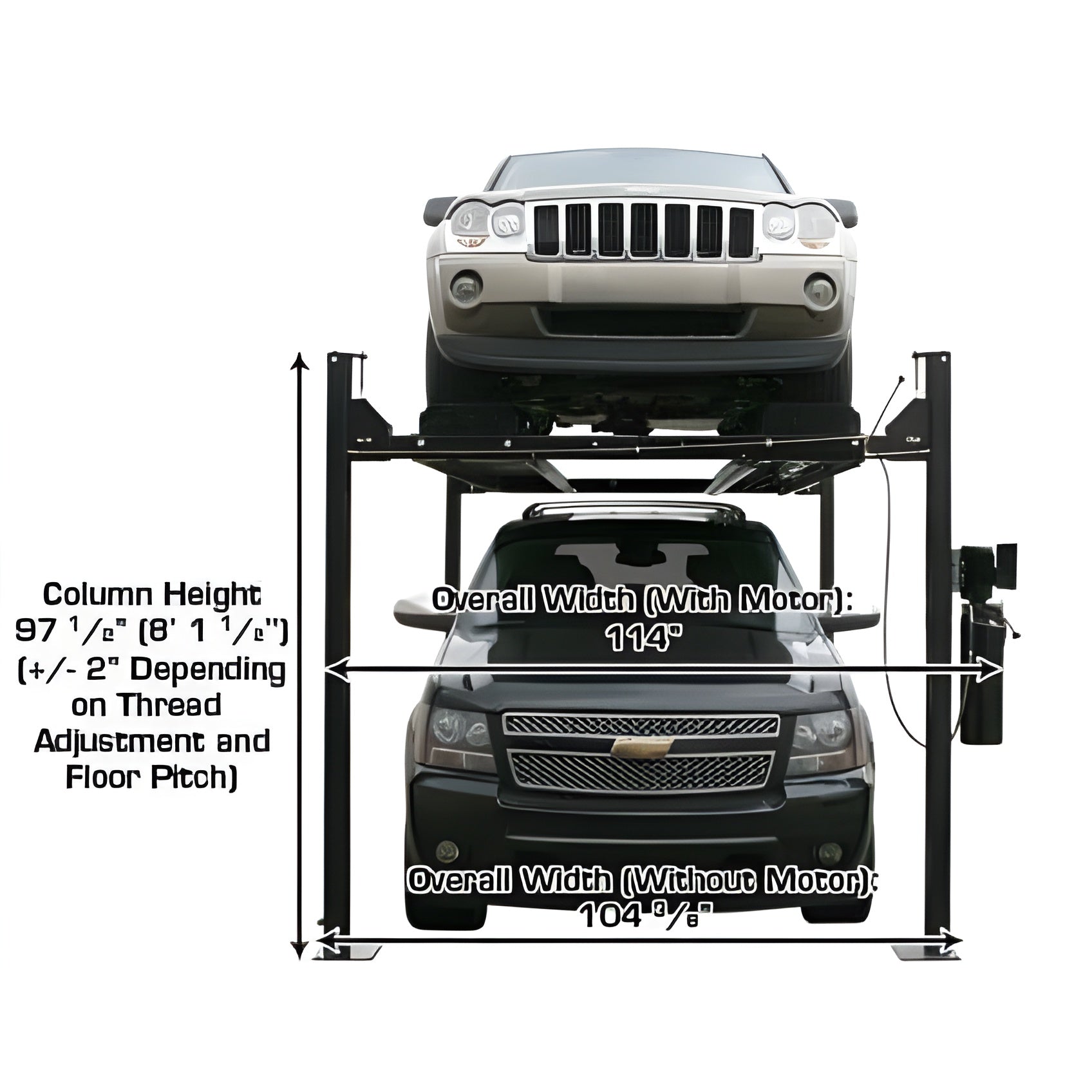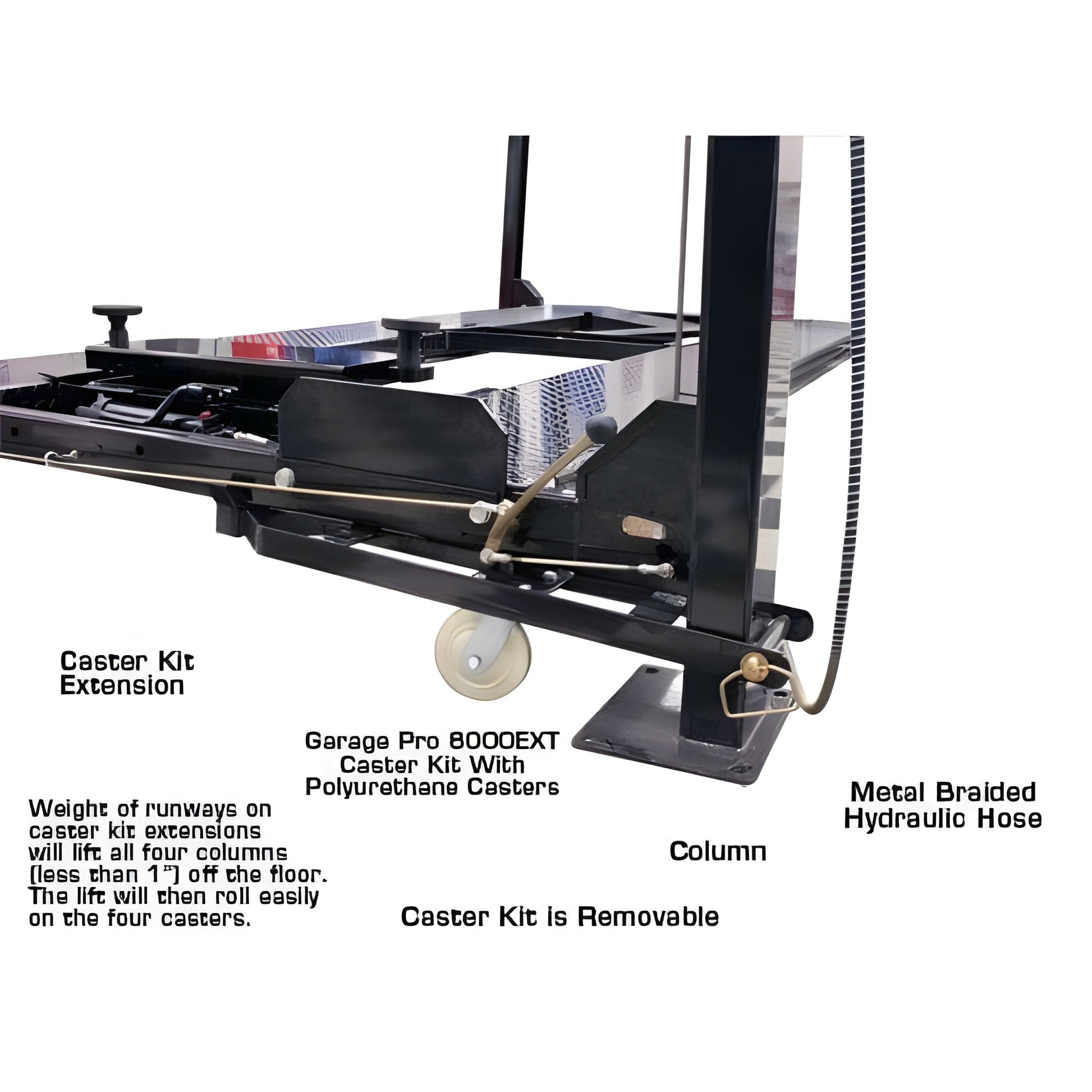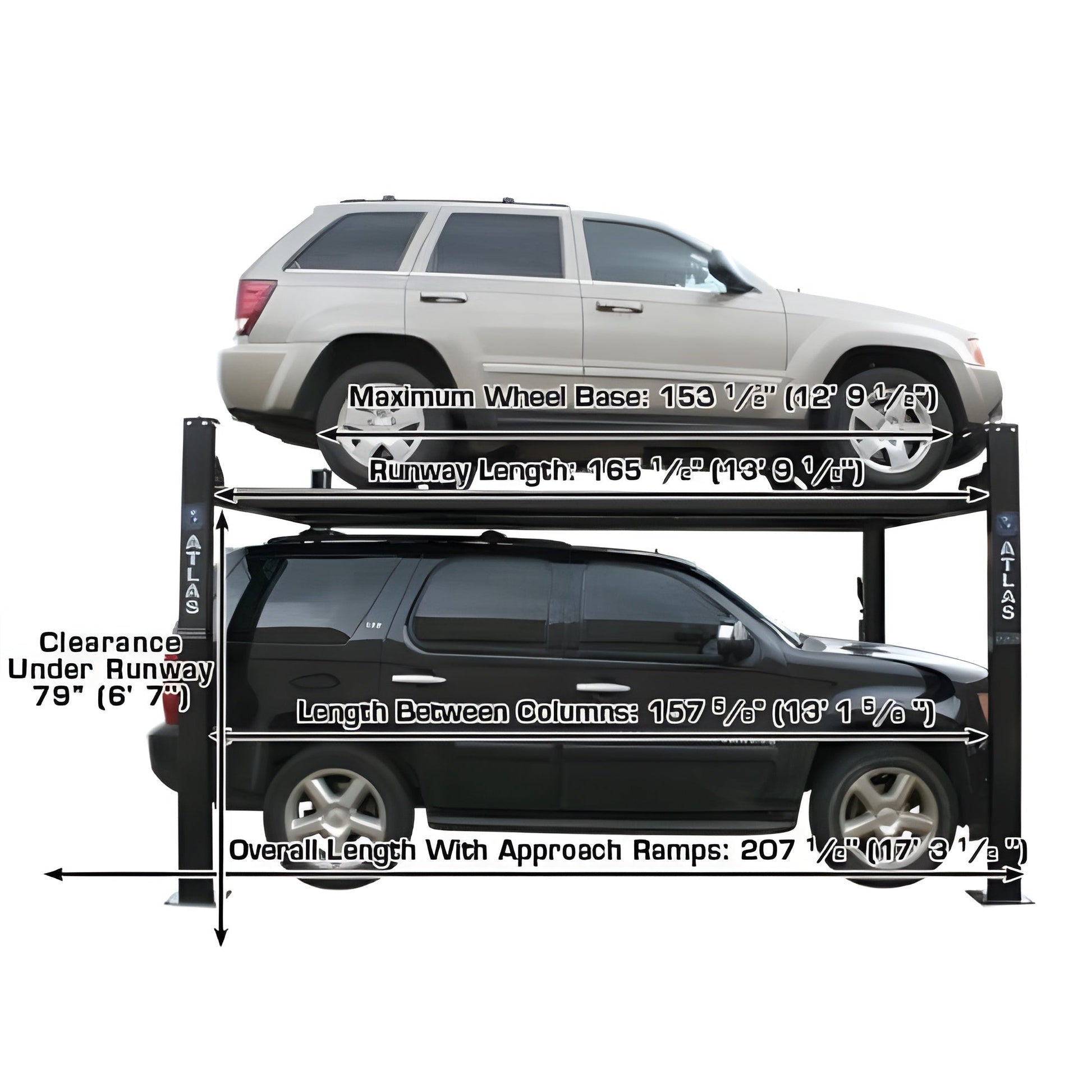 The Atlas Garage PRO8000EXT is a true 8,000 LB. four post lift and is one of our most popular hobbyist lifts. This lift incorporates many of the great features of both the Atlas Garage PRO8000 and the Atlas Garage PRO9000.Many of our customers drive an SUV or pick-up truck and wanted a storage lift that would “go higher” to allow them to park their taller vehicles under the elevated platform. Many of our competitors sell “taller” lifts. However, their “taller” lifts also have longer runways. Our customers requested that we make a lift which lifts higher, but without the extra length (longer runways take up valuable garage space). Most customers want to store a car on top and park a SUV or pick up truck below. The Atlas Garage Pro 8000 EXT has been engineered to provide 79″ of clearance UNDER the bottom of the raised runway. If you need the extra lifting height of the Atlas Garage Pro 9000, but do not need the extra width and runway length provided by that lift, then the Atlas Garage PRO8000EXT is the perfect choice.This combo package also includes two of the popular Atlas® RJ35 sliding bridge jacks. The jacks are perfect for raising a vehicles wheels off the lifts runways in order to service tires and brakes.
