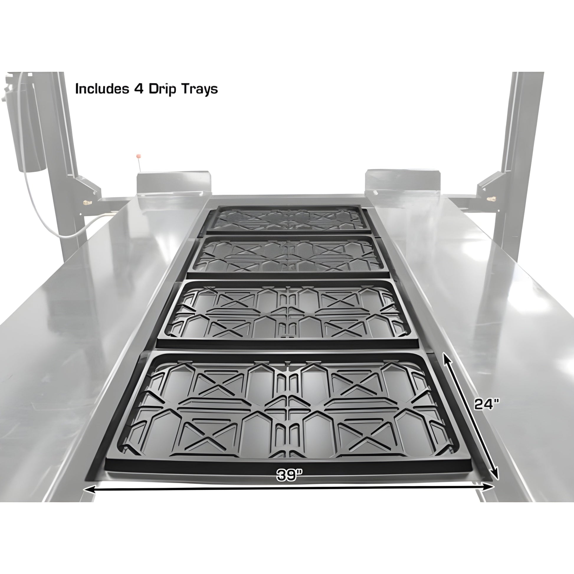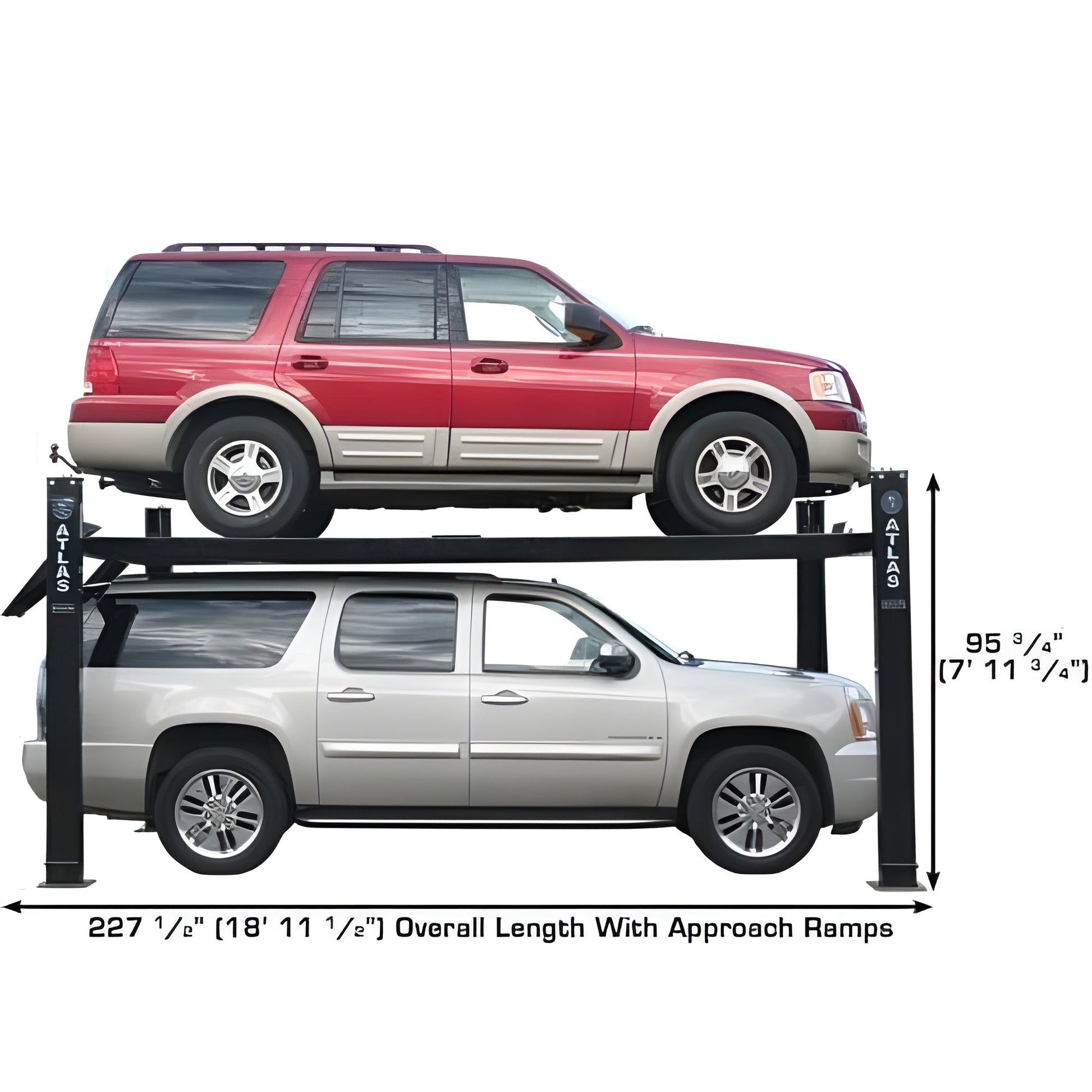 The Atlas Garage PRO9000 4 post lift is a heavy duty hobbyist lift and features the highest lifting capacity of all our Garage PRO series lifts. The Garage PRO9000 is extra long and has the longest runways (we believe) of any portable 9,000 LB. four post on the market. That feature allows the lift to handle some of the longest wheel base vehicles out there. The Garage PRO9000 is extra wide allowing even Diesel Duallys to be driven onto the runways. This lift also features extra height so everything from Smart Cars to a Dually can be parked both below and on the runways.The commercial grade features of the Garage Pro 9000 make this lift the perfect choice for automotive service center or βMr. Homeownerβ that needs a PORTABLE professional four post lift at a competitive price.This combo package also includes two of the popular Atlas RJ6 rolling bridge jacks. The jacks are perfect for raising a vehicles wheels off the lifts runways in order to service tires and brakes.