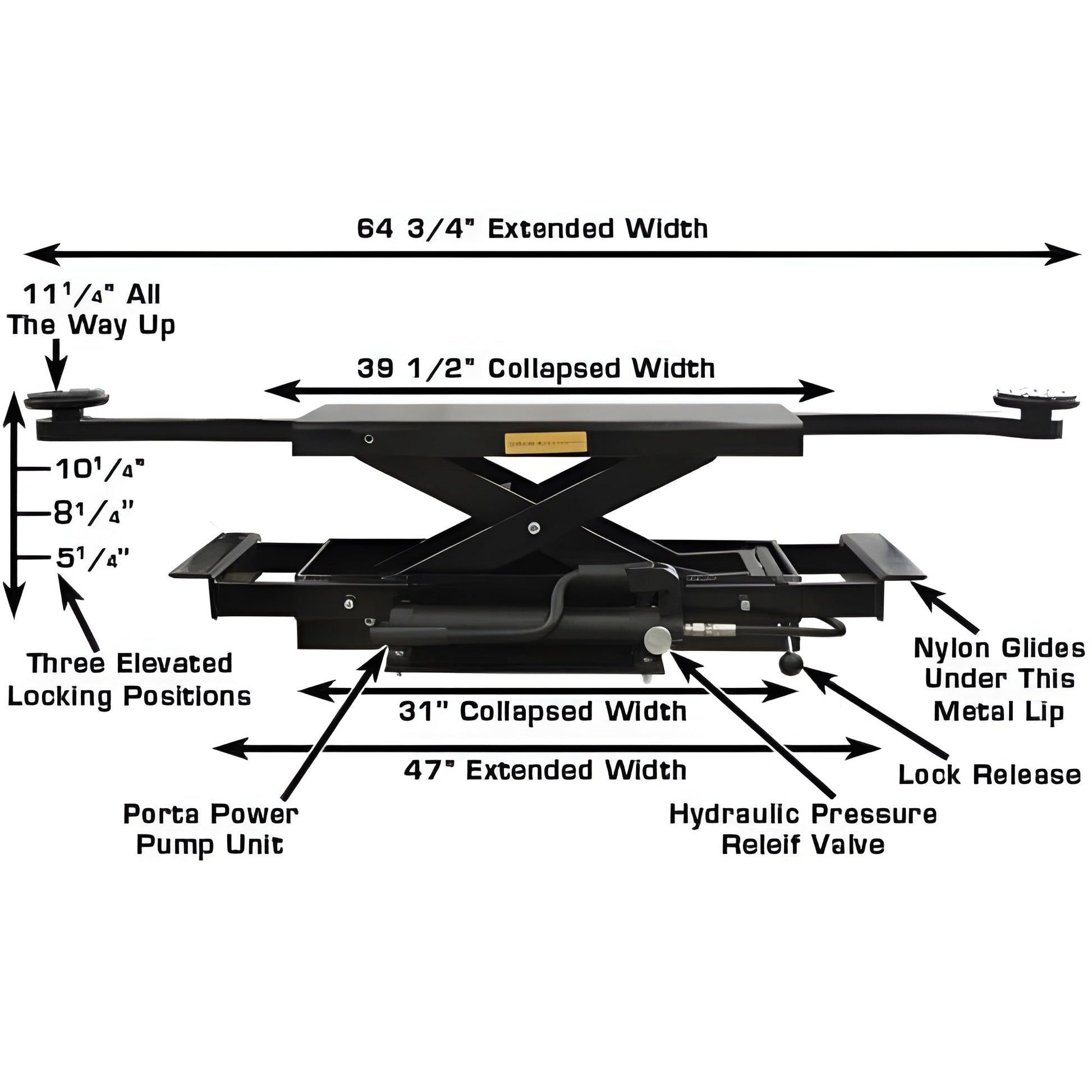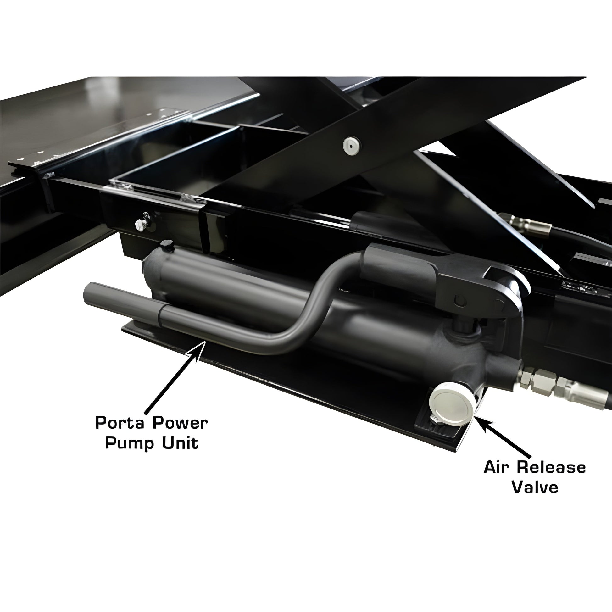 The Atlas RJ35 (3500 LB. capacity) sliding hydraulic bridge jack is the perfect choice for the owner of the Atlas Garage PRO8000 or any of our other Atlas Garage Pro lifts. The RJ35 Sliding Jack will also work on our other hobbyist four post lifts such as the ALI Certified Atlas APEX8 and APEX9 as well as the Premium Atlas 408SL and 409HP. The RJ35 Sliding Jack is perfect for those who want to perform wheel service on a vehicle that is positioned on top of their four post lift.Most four post hobbyist lifts come with a jack tray. The jack tray has certain limitations that are eliminated by using the Atlas® RJ35 Sliding Jack. The jack tray (with a small floor jack or jack stands) will support ONLY THOSE LIFTING POINTS of the raised vehicle that are between the runways of the four post lift. The RJ35 Sliding Jack has telescoping arms that can be extended over the runways of the four post lift. The lift pads at the end of these arms can be positioned under the LIFTING POINTS (that are located over the runways of the four post lift) of the vehicle allowing the operator to access many more LIFTING POINTS than just using the jack tray.The Atlas RJ35 Sliding Jack comes standard with a set of peg style truck adapters which increase the lifting height of the lift pads. These truck adapters will allow the RJ35 Sliding Jack sliding hydraulic jack to raise pick up trucks that will sit higher on the runways than the average passenger car. The RJ35 Sliding Jack is operated by a manual hydraulic pump (porta-power pump) and does not require an air compressor for power. This jack also features two solid locking positions that are used when the vehicle is to be suspended above the runways. When the locking positions of the Atlas RJ35 Sliding Jack are engaged, the hydraulic pressure from the lifting cylinder of the jack is eliminated. (These locks act much like a pair of jack stands after you lift a vehicle off the ground with a service jack).