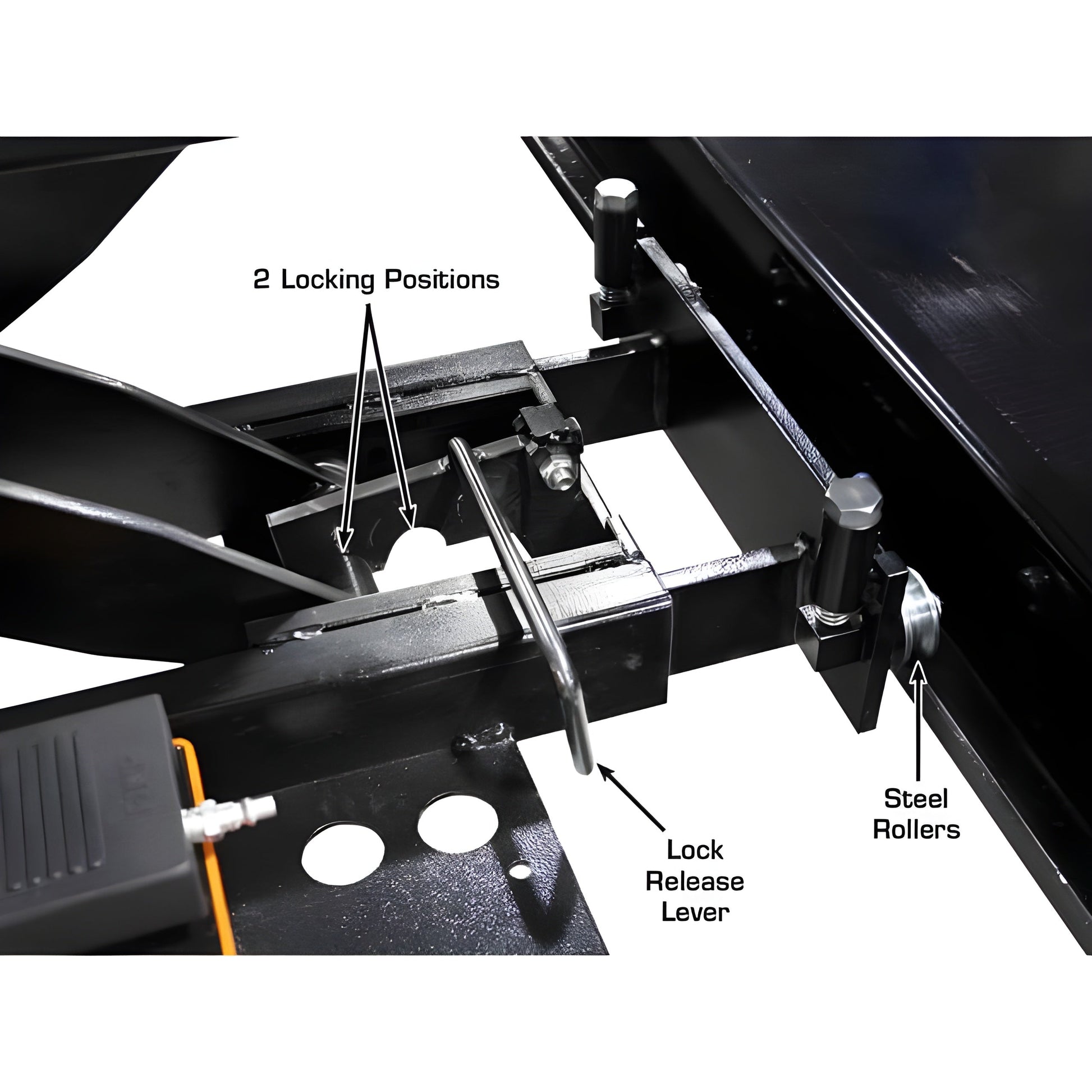 The Atlas RJ6 air/hydraulic rolling jack has telescoping arms that can be extended over the runways of a four post lift. The lift pads at the end of these arms can be positioned under the lifting points that are located over the runways of that four post lift. This rolling jack is equipped with expandable rail supports which adjust to fit between the runways of many different four post above ground lifts. These supports have a unique roller system that allows the rolling hydraulic jack to glide easily under the entire length of the vehicle.The Atlas RJ6 rolling bridge jack comes standard with a set of peg style truck adapters which increases the lifting height of the lift pads. These truck adapters will allow the RJ6 to raise most pick up and larger trucks that will sit higher than the average passenger car. The RJ6 rolling hydraulic jack features two solid locking positions that are used when the vehicle is to be suspended above the runways. When the locking positions are engaged, the hydraulic pressure from the lifting cylinder of the jack is eliminated. (These locks act much like a pair of jack stands after you lift a vehicle off the ground with a service jack).IMPORTANT: The Atlas RJ6 is designed and engineered to operate on βdeliveredβ air pressure of between 70-115 PSI. If you exceed 115 PSI, you may damage your jack.