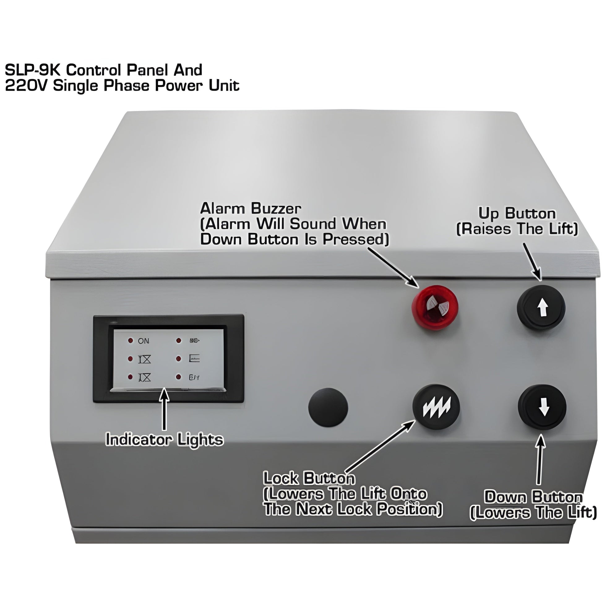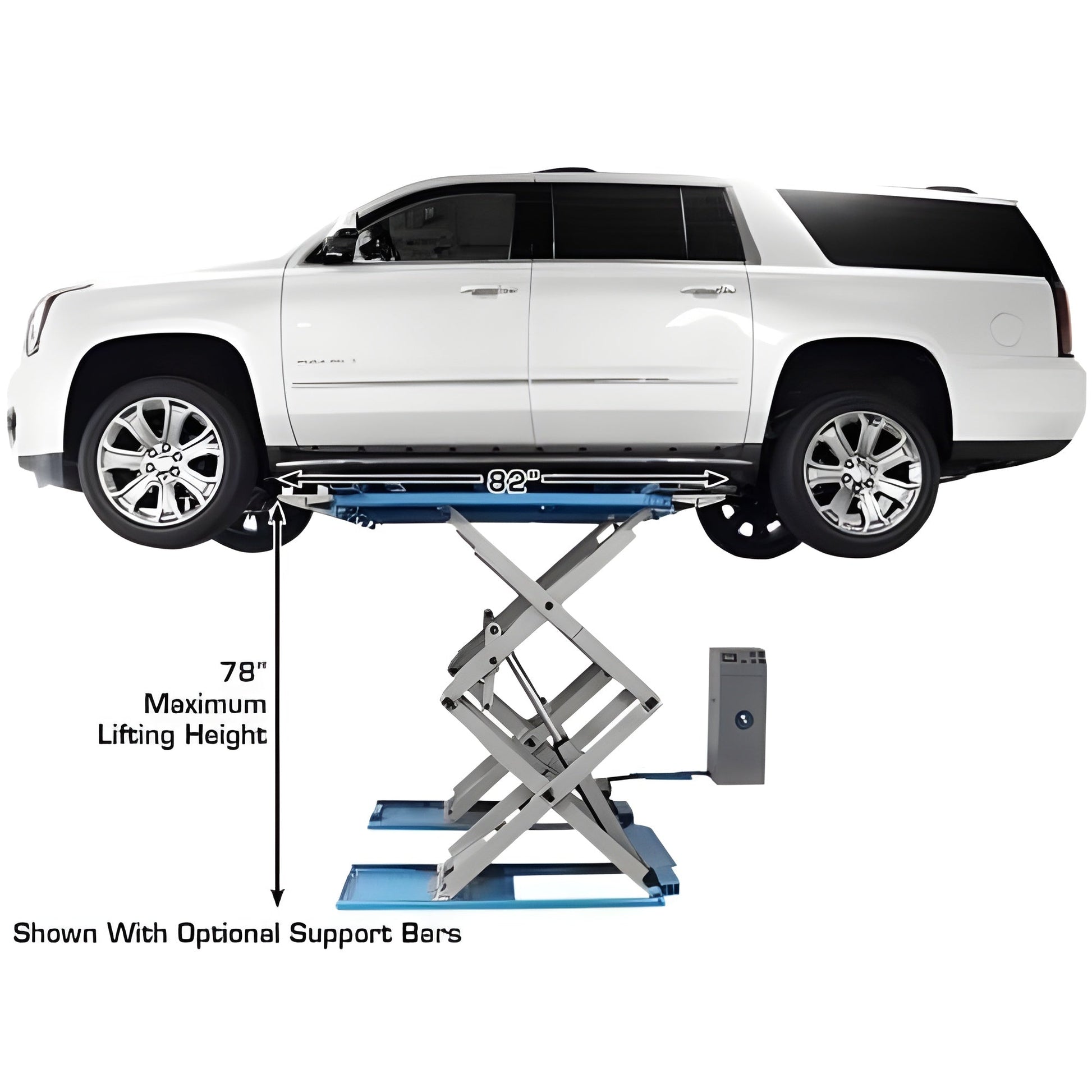 The Atlas SLP9K full rise scissor lift combines an extremely low lift platform height and a 78 inch full rise scissor jack system. The SLP9K full rise lift is the perfect above ground lift for those customers with ceiling height restrictions and the need for “enough lift” to raise pick-up trucks. This lift is also perfect for those service shops that want to avoid the cluttered look of dozens of vertical lift columns.The Atlas SLP9K can also be flush mounted. The flush mounted scissor lift gives the service area a “clean look” and also provides a “flat surface” which can be driven over from any angle, making it easy to position the vehicle over the lifting platforms.The 31″ adjustable distance between the lift platforms of the Atlas SLP9K scissor lift can accommodate a full frame, uni-body, or SUV (truck) lifting points. It is highly recommended that you purchase the Atlas® Scissor Lift Support Bar Kit if the intended use is for lifting heavier vehicles (pickup trucks and SUVs) with narrow frames. The best way to position any vehicle on a scissor lift (with horizontal cylinders) is to allow some space (2-6 inches) between the lifting surface of the lift and vehicle’s lifting points.The separate control panel may be conveniently positioned to allow easy access for the operator. The 220 volt (single phase) electric/hydraulic power unit is housed inside the metal control panel box. The push button controls activate the raising and lowering of the lift. The sophisticated 10 position air actuated lock system is automatically engaged and disengaged as the lift is being raised or lowered. The lift has a safety lowering limit switch. Once the lift platforms are lowered to within 10 ½ inches of the ground, the lift automatically stops its descent. The Down button needs to be released and depressed again to allow the lift to go down completely.