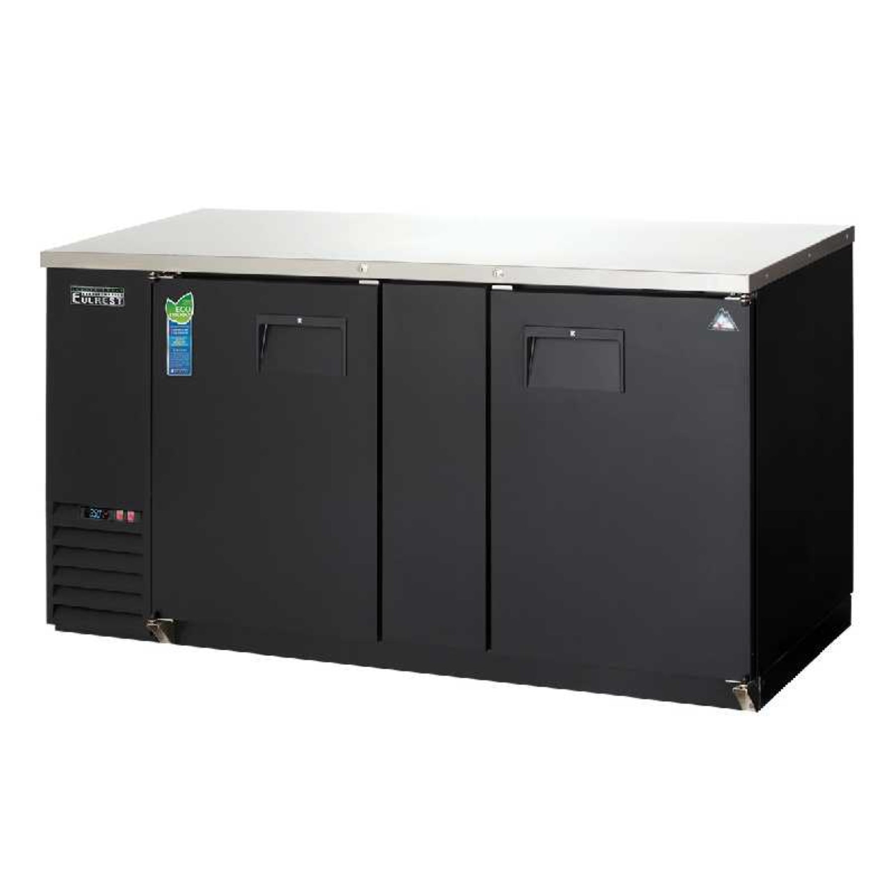 A: Solid doors retain cold air efficiently, while the stainless steel worktop offers a durable, sanitary surface for bar prep.