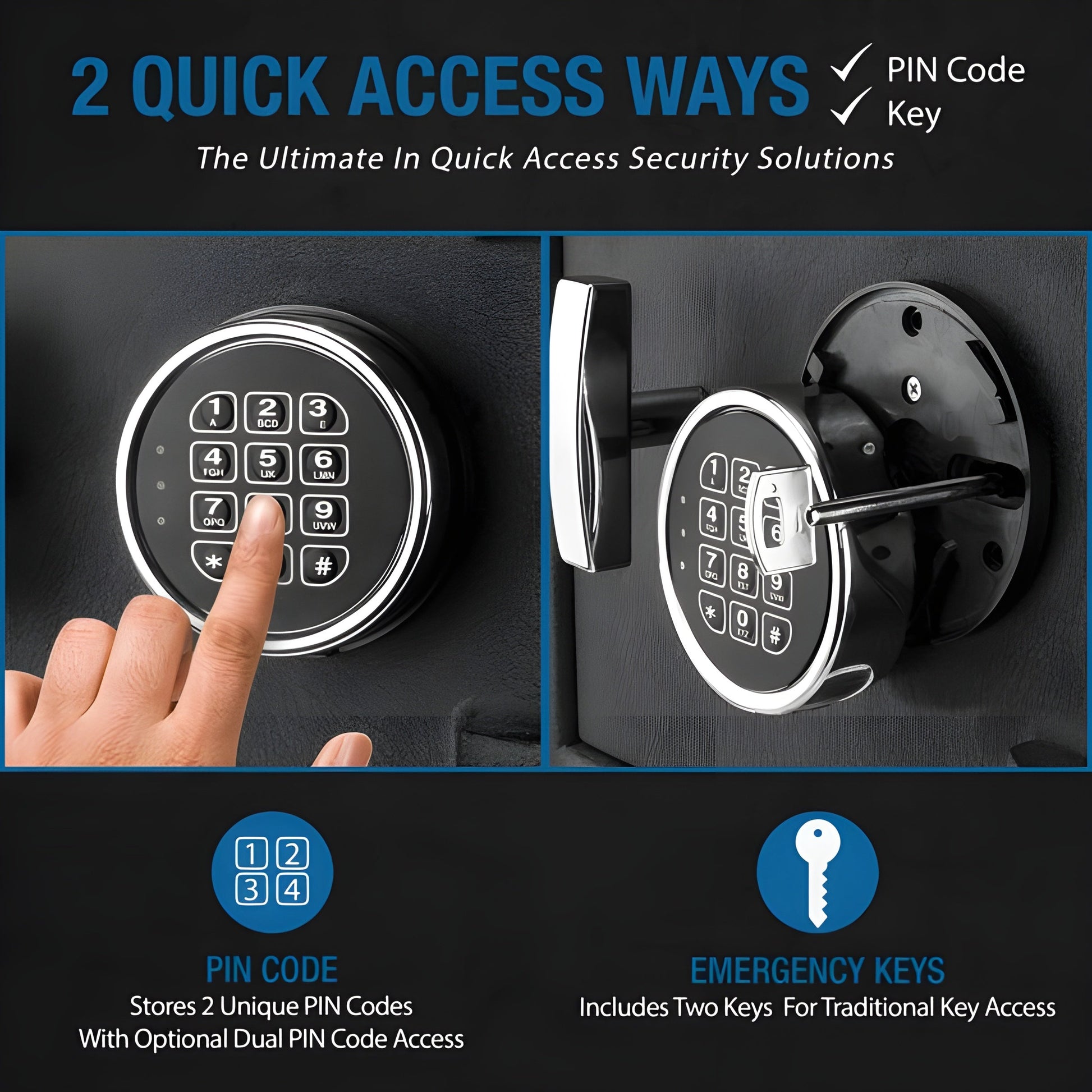 Effortlessly navigate the safe's features with its intuitive digital keypad design. The setup and operation process is remarkably user-friendly, accommodating two distinct PIN codes for authorized users. The anti-pry door is further reinforced by three steel deadbolts, ensuring access solely through the input of the correct PIN code.
