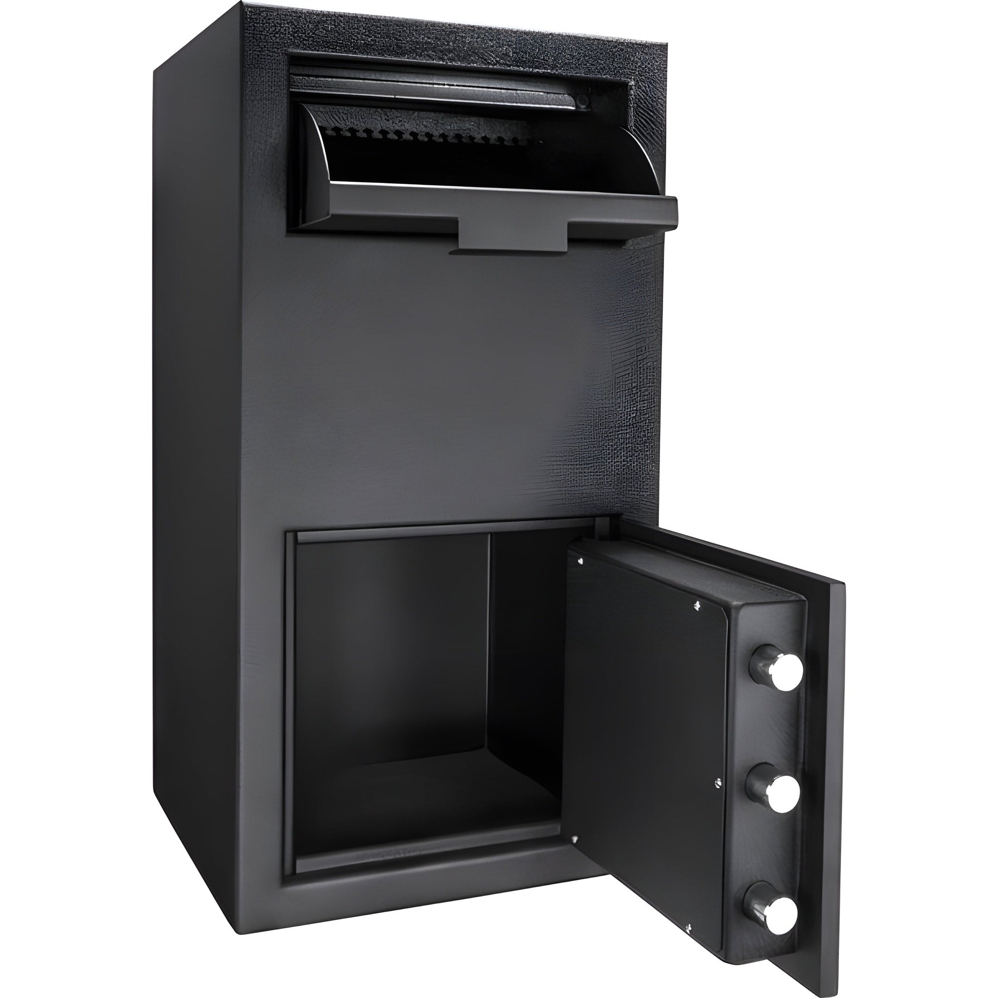 - Three steel deadbolts set in the anti-pry door help ensure that the depository safe door can only be opened when the correct PIN code is inputted.