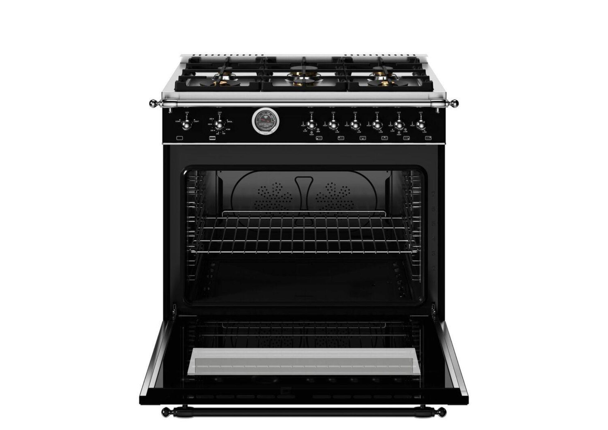 The Bertazzoni HER366BCFGMNET 36-inch freestanding gas range seamlessly blends Italian craftsmanship with advanced cooking technology. The cooktop boasts six high-efficiency sealed brass burners, including two dual-ring 19,000 BTU power burners that can boil water in under six minutes, and four additional burners offering variable sizes and power levels to accommodate various cooking styles. The stainless steel worktop is formed from one piece, allowing easy cleaning with no gaps, joints, or screws.
