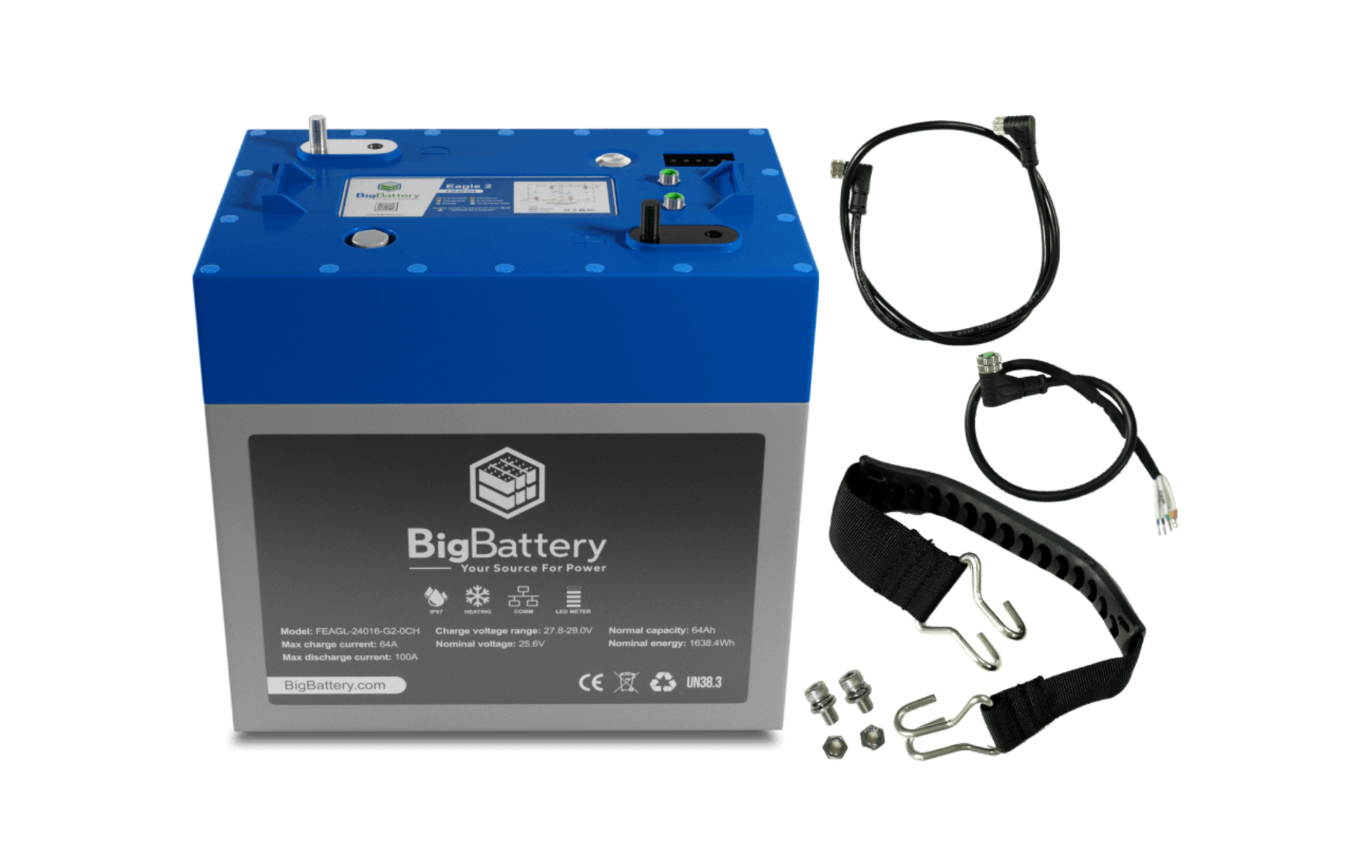 2ND GENERATION POWER TAKES FLIGHT! Introducing BigBattery’s all-new 24V 6.52 kWh LiFePO4 4x EAGLE 2 Kit. The EAGLE 2 embodies the reliability and durability you’ve come to expect from BigBattery solutions, packing Tier 1 LFP cells in a compact, GC2 form factor. This energy-dense design allows for effortless installations in your RVs, camper vans, scissor lifts, or other industrial equipment, and the EAGLE 2 serves as a mirror-image replacement for any stock T-105 lead-acid battery.