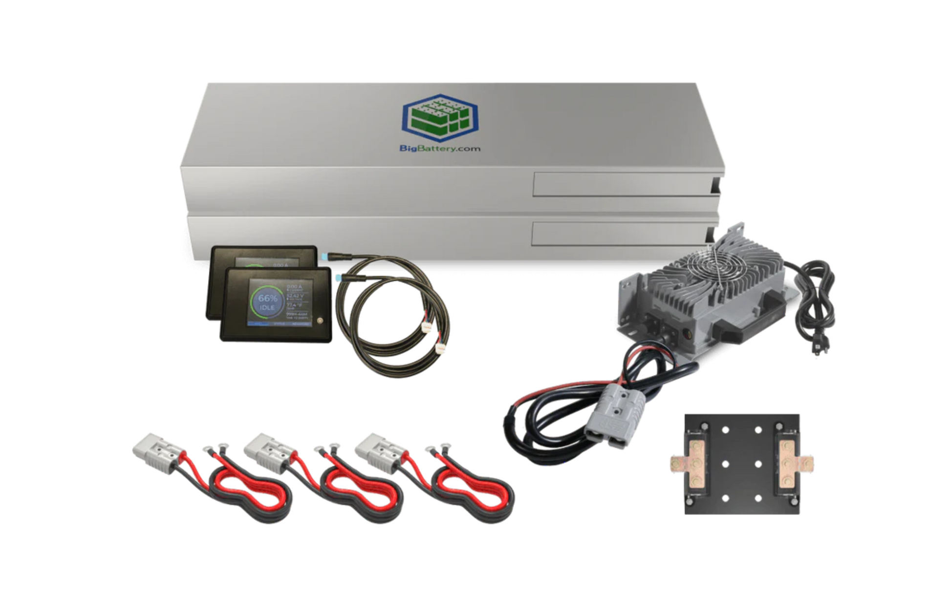 A: Two compatible 48V deep‑cycle Mustang batteries configured as a 48 V battery bank (charger/inverter not included).